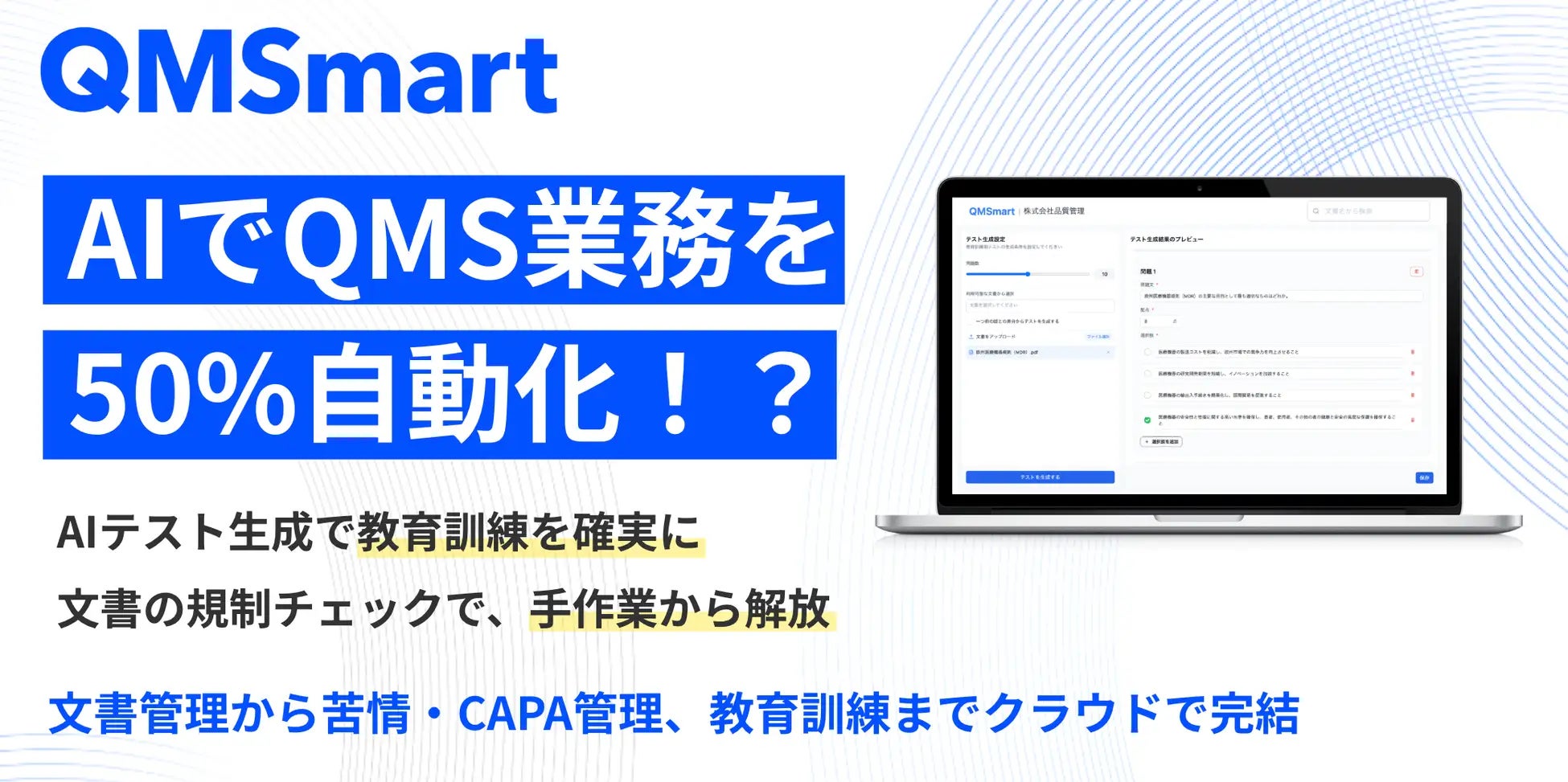 「QMSmart」は、文書管理、CAPAを含む品質イベント管理、教育訓練など、煩雑になりがちなQMS業務をクラウド上で一元化。中小企業を中心に、属人化・人材不足といった課題解決をサポートします。