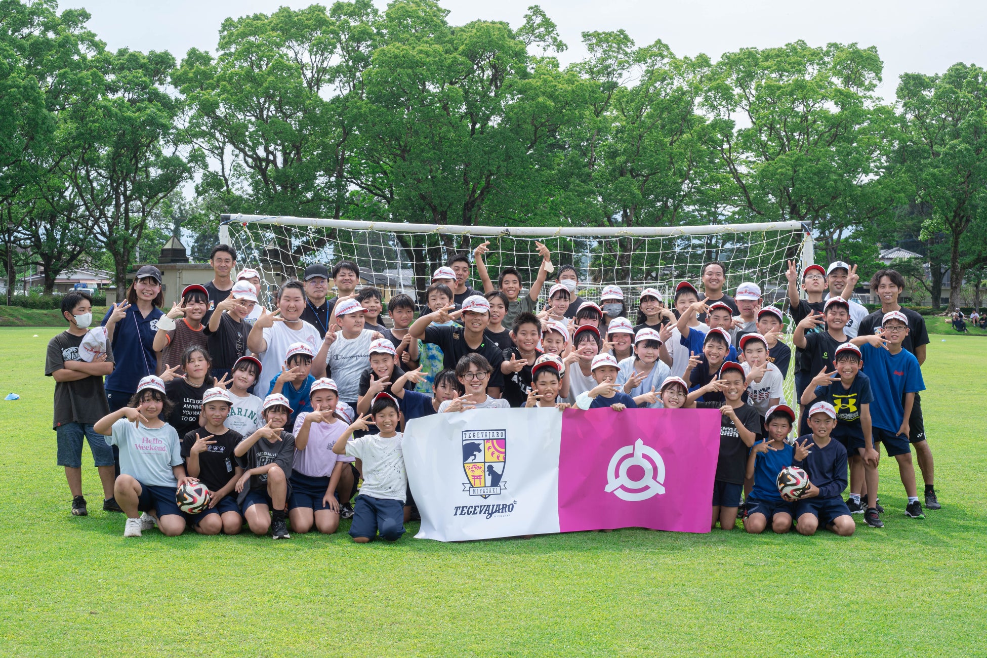 協定前に行われたサッカー教室には、会場近くにある本庄小学校の6年生約50人が参加。基本的なボールの扱い方を学んだあと、テゲバジャーロ宮崎の眞鍋旭輝(ひかる)主将らを交えてミニゲームが行われ、ゴールが決まると大きな歓声が上がっていました。