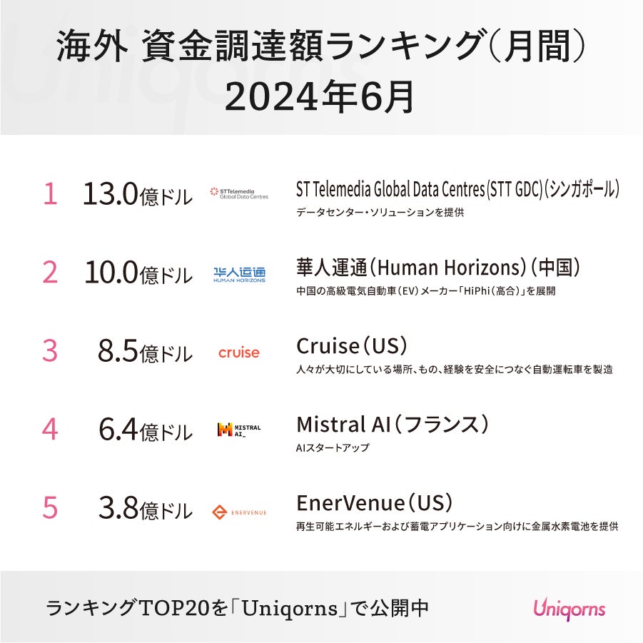 国内最大級のスタートアップメディア「Uniqorns(ユニコーンズ)」が2024年6月の海外スタートアップ資金調達状況をランキング形式で発表