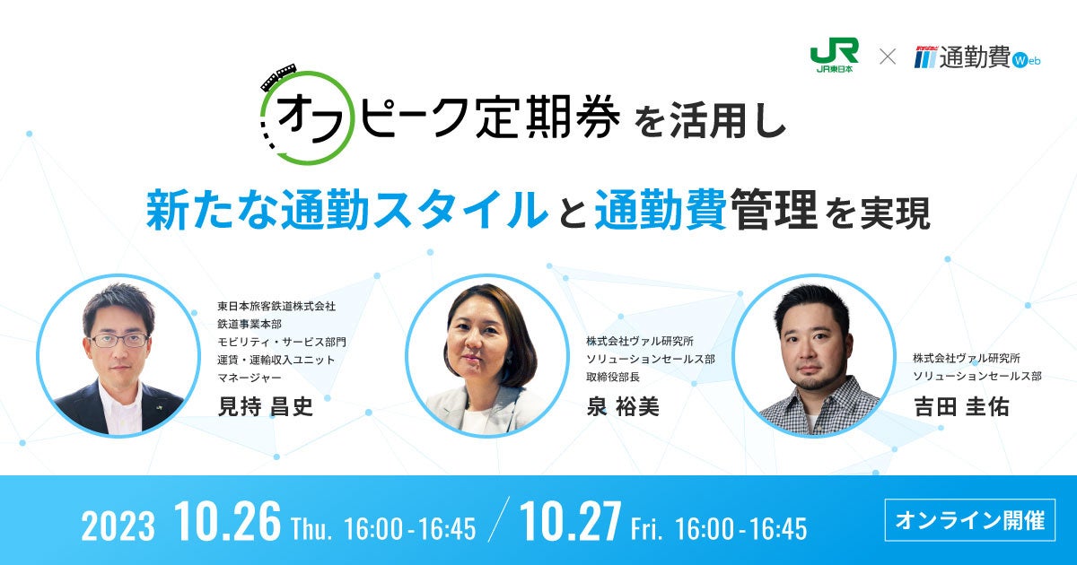 【10月26日(木)、27日(金)無料オンラインセミナー開催】JR東日本 × ヴァル研究所 オフピーク定期券を活用し、新たな通勤スタイルと通勤費管理を実現