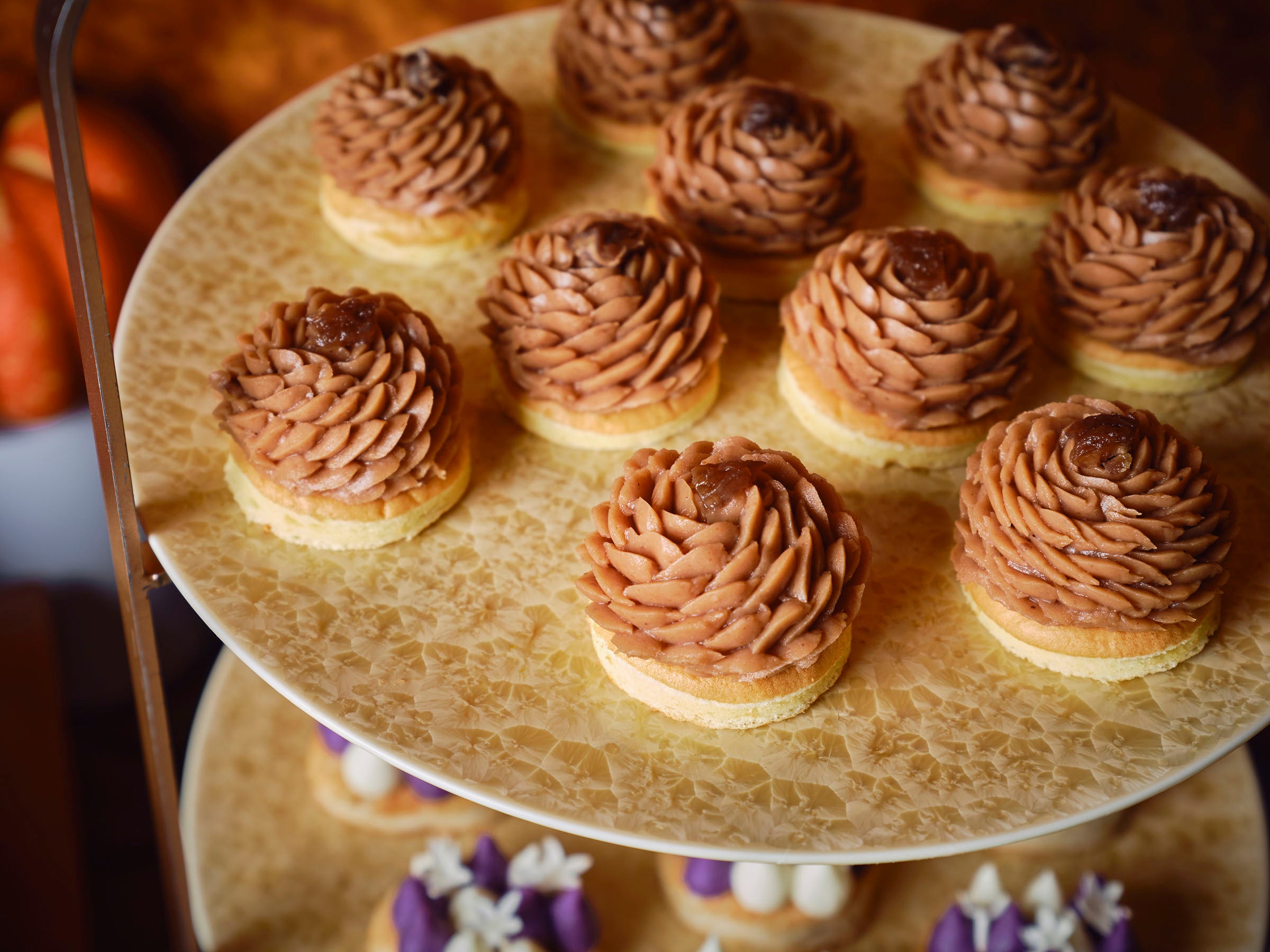また秋の味覚を代表するスイーツとして、いもくりなんきんの3種類の味が楽しめるモンブランをご用意。紫芋とマスカルポーネのクリームを雫のようにあしらった華やかな「さつまいもモンブラン」や、フランスから取り寄せた上質な栗のペーストでカシスのジュレとバニラムースを包み松ぼっくりのように仕上げた「マロンモンブラン」、甘味が強く濃厚な味わいが特徴の北海道産かぼちゃのクリームを美しく絞り出した「かぼちゃモンブラン」の3種類の食べ比べをお楽しみください。他にも、軽く焦げ目をつけた洋梨をトッピングしたシャルロットや、キャラメルとリンゴのロールケーキ、柿ドームムース、マロンタルト、さつまいもケーキなど、秋を色濃く感じるオータムスイーツたちがお目見えします。また桃や梨、ぶどうやみかんなどフルーツをそのままお楽しみいただけるコーナーもあり、スイーツの合間のお口直しにもぴったりです。