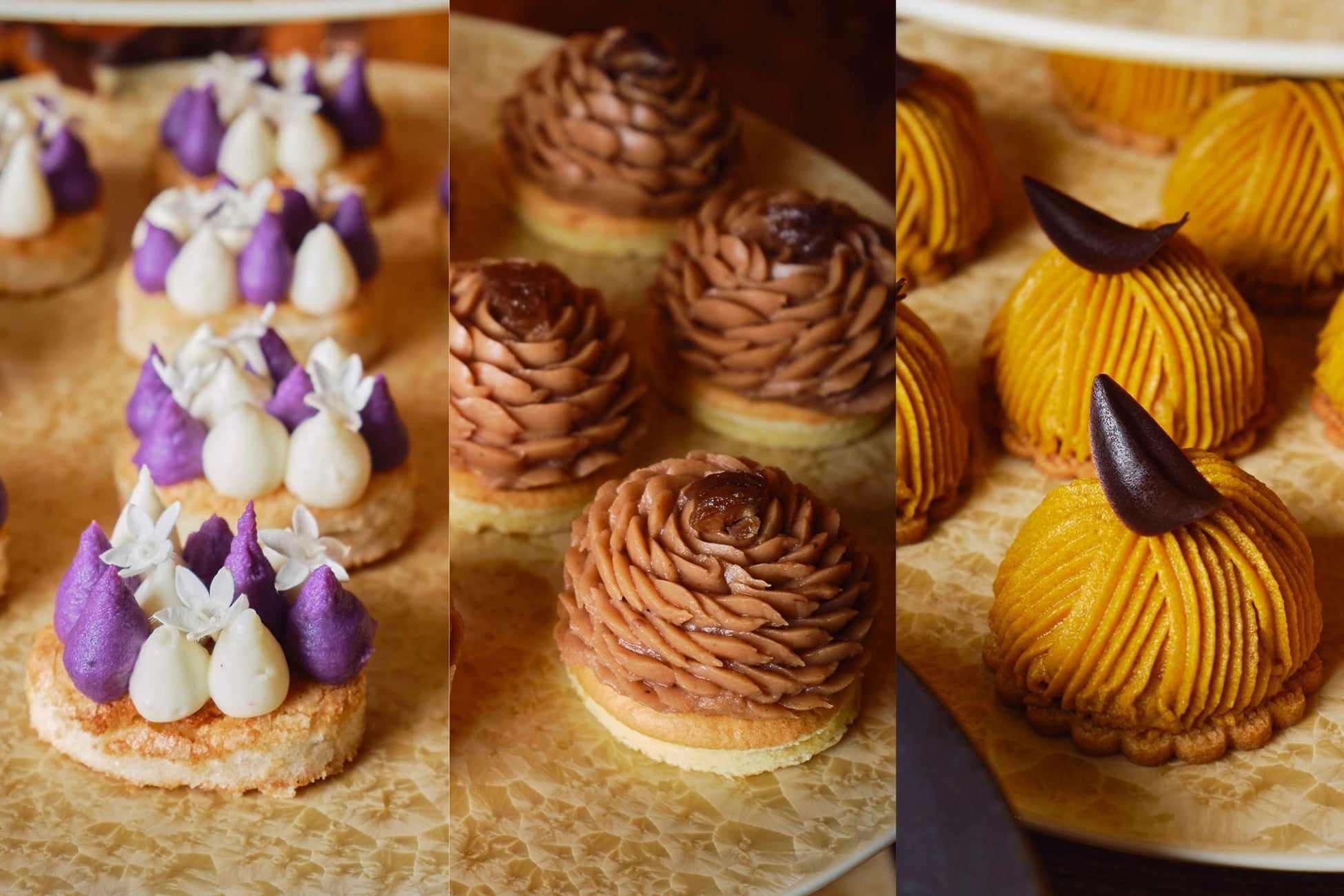 マロンモンブラン、かぼちゃモンブラン、さつまいもモンブラン、かぼちゃシュー、さつまいもシュー、マロンシュー、洋梨シャルロット、キャラメルアップルロール、柿ドーム、アップルドーム、みかんドーム、マカロン ショコラ、ハロウィンカップケーキ、マロンタルト、ショートケーキ、マロンケーキ、フルーツタルト、チョコレートタルト、さつまいもケーキ、マスカットゼリー、ぶどうゼリー、かぼちゃプリン、カラメルプリン、チョコレートカップ、みかんパフェ、他