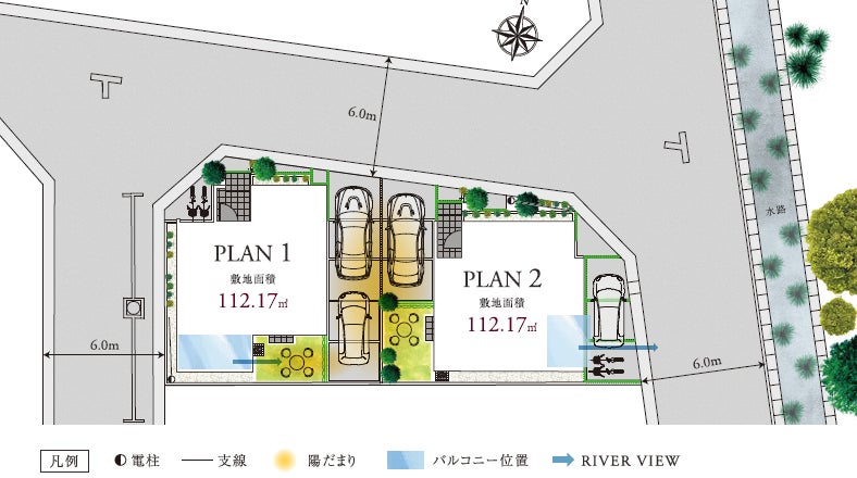 112.17㎡の敷地面積+前面道路6.0mの角地の開放感に恵まれた2邸。南面には庭があり、陽だまりスペースとなり採光性を高めています。