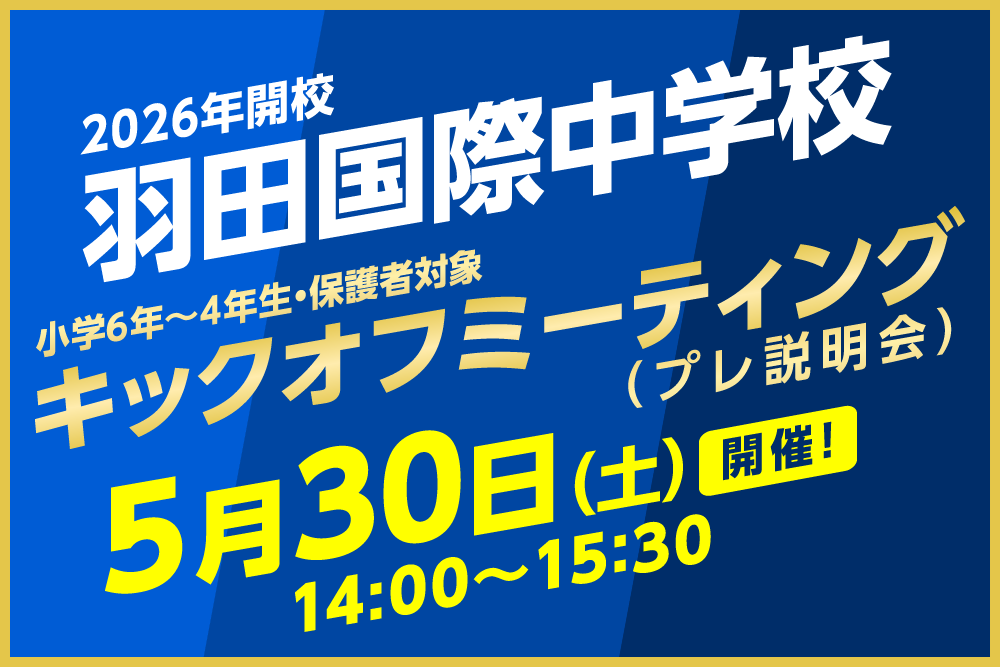 令和8年4月に開校した羽田国際中学校でも、キックオフミーティング(プレ説明会)を5/30(土)に開催します。第1期生を迎えた羽田国際中学校の「今」をリアルにお伝えするほか、国際教育・スクールライフ・制服、そして昨年度の入試結果についてもお伝えします。新校羽田国際中学校を知っていただける重要な説明会となっております。こちらも生徒・教職員一同、皆様のご参加を、心よりお待ちしております。