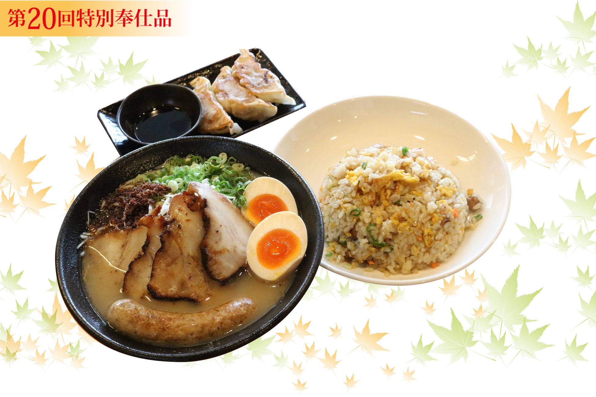 20回記念特別セット 剛麺(チャーシュー2枚プラス・チャーセージ・味玉)、半チャーハン、黒豚餃子3個(1セット)★各日20セット限り 2,000円
