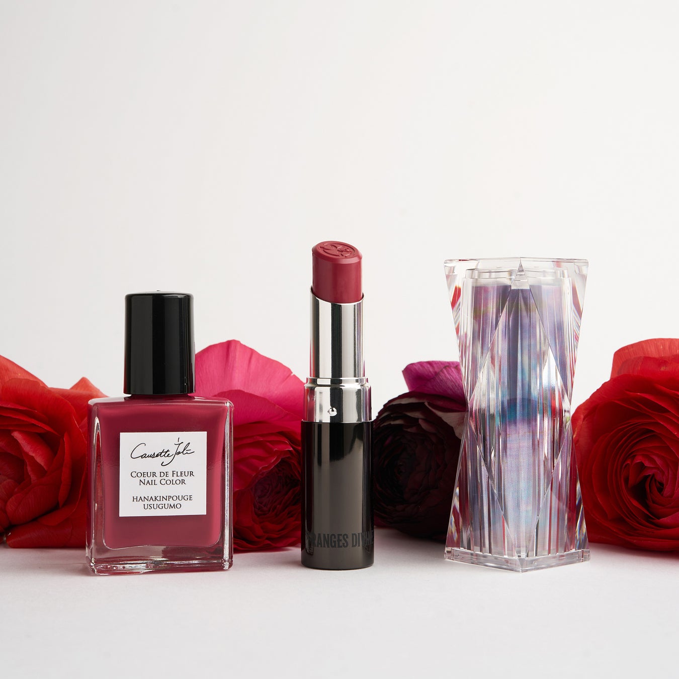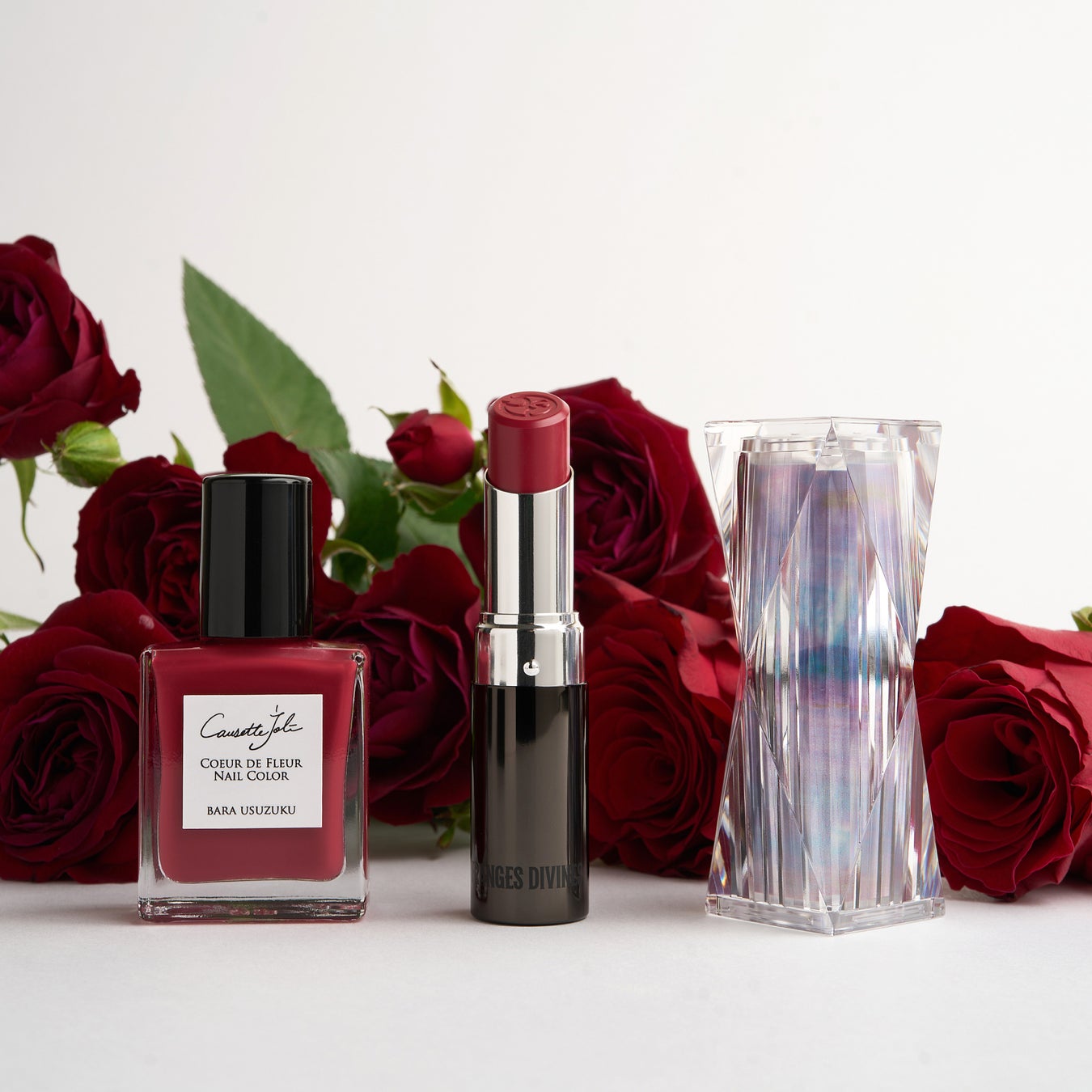 今回のタイプの異なる赤系4 色は、リップと同じ色のカラーをマニキュアで実現し、いずれも今までのコゼットジョリの一番濃い色よりもさらに濃い色に設定し、1 度塗りでしっかりと発色する特別仕様です。フランジェディヴィヌがパリ発ということで、今までは日本の花や情景を色にしていたコゼットジョリですが、今回のコラボカラーはあえてパリの街に親しみのある花を採用し、あえて和名で表現。名前の後半はリップの名前(天象を表す雅語)がついています。