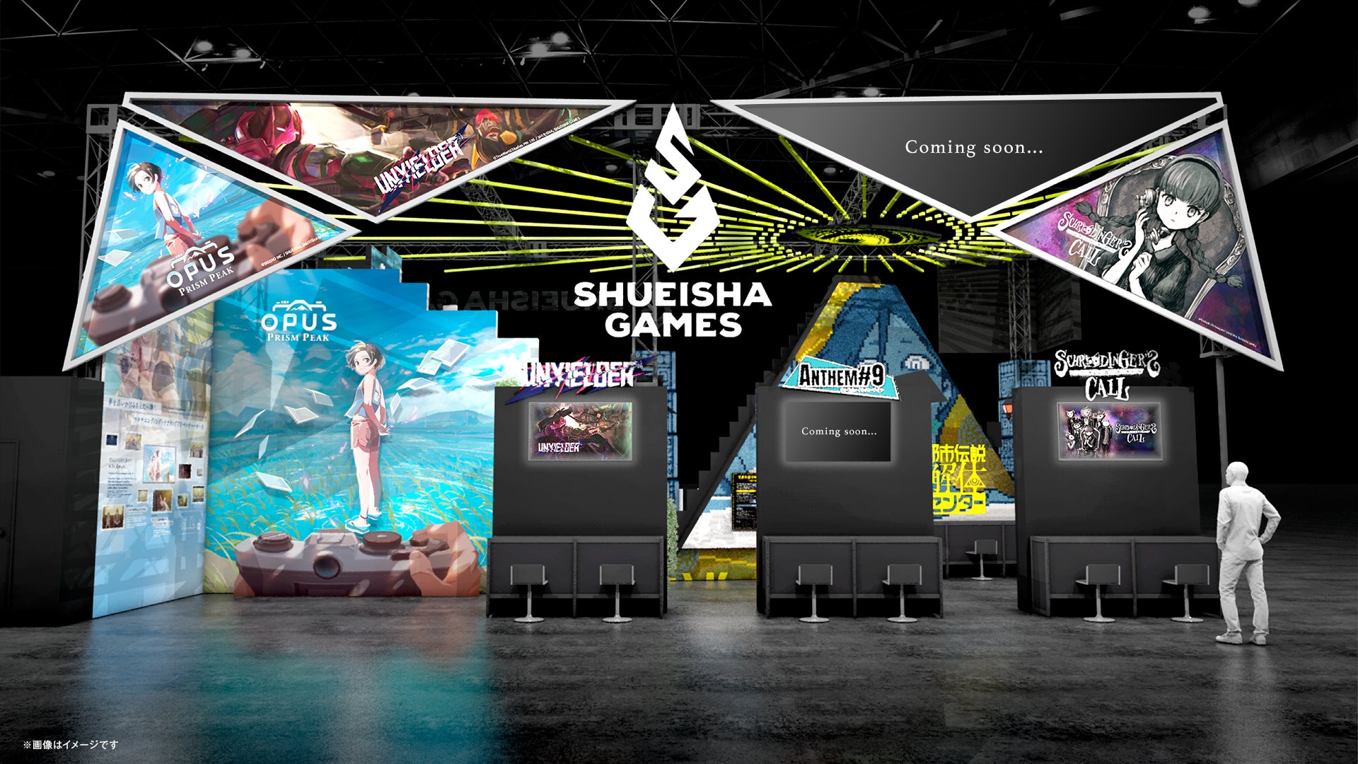 集英社ゲームズブースは、「ゲームの世界観を体感できる」をテーマにしており、『都市伝説解体センター』のゲーム中に都市伝説を“特定”した際に現れるピラミッドと、ゲーム中に登場する施設「都市伝説解体センター」の外観をイメージしたデザインになっています。ブース裏面には、『OPUS: Prism Peak』のキービジュアルを立体的に表現したスペシャルフォトスポットを配置し、『シュレディンガーズ・コール』『UNYIELDER』『ANTHEM#9』もそれぞれの世界観に合わせた作りになっています。