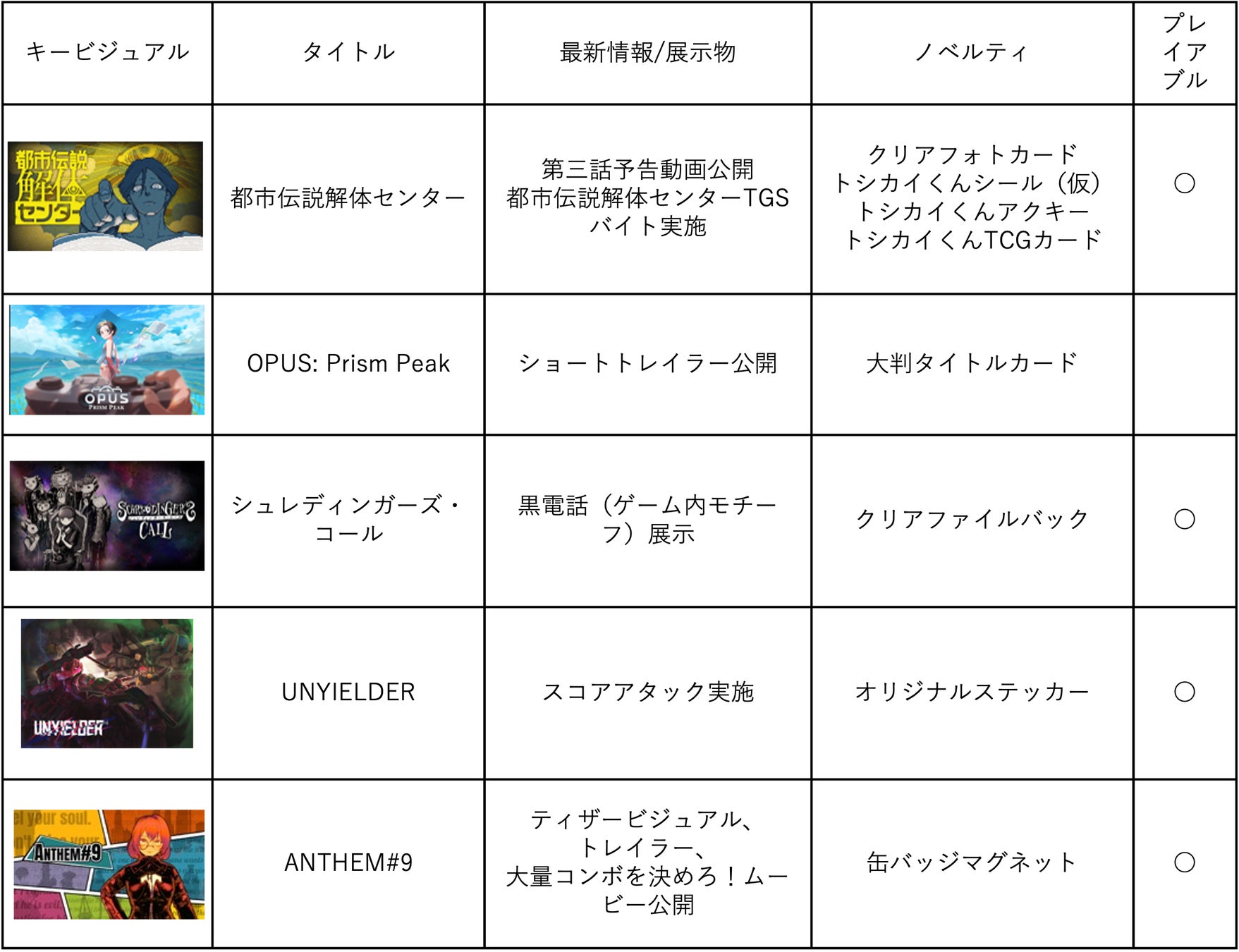 ■各タイトルの出展内容一覧: