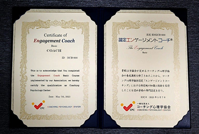 【認定エンゲージメント・コーチ®認定講座】当ワークショップを修了されると「認定エンゲージメントコーチ®」(Basic)の資格が取得できます。また、講座の資料の利用権、ダウンロード権などが得られ、すぐに実践できます。