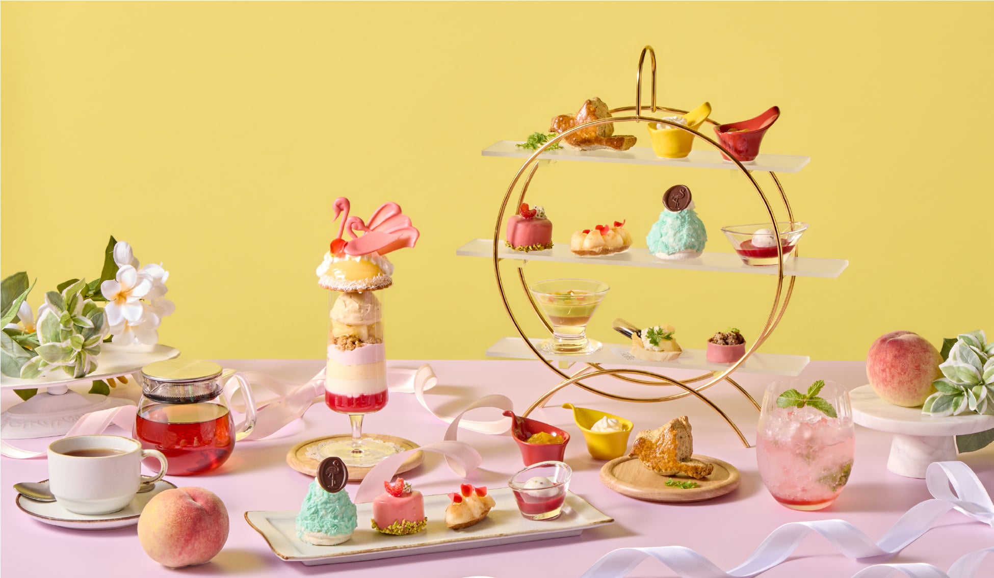 うれしい驚きと新しい味の発見が詰まったパフェをメインに、ヨーロッパの伝統菓子をアレンジしたスイーツ4品、まるでスイーツのような華やかな見た目のセイボリー3品、そしてご好評いただいてることり型のスコーンをのせたスタンドでお届け。特製モクテルとともにお楽しみいただけます。