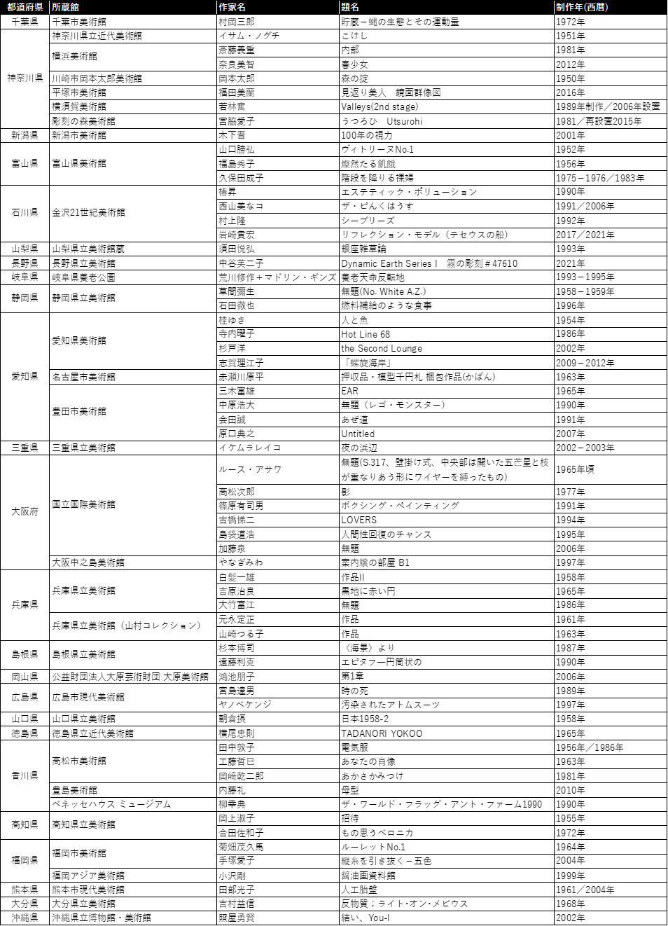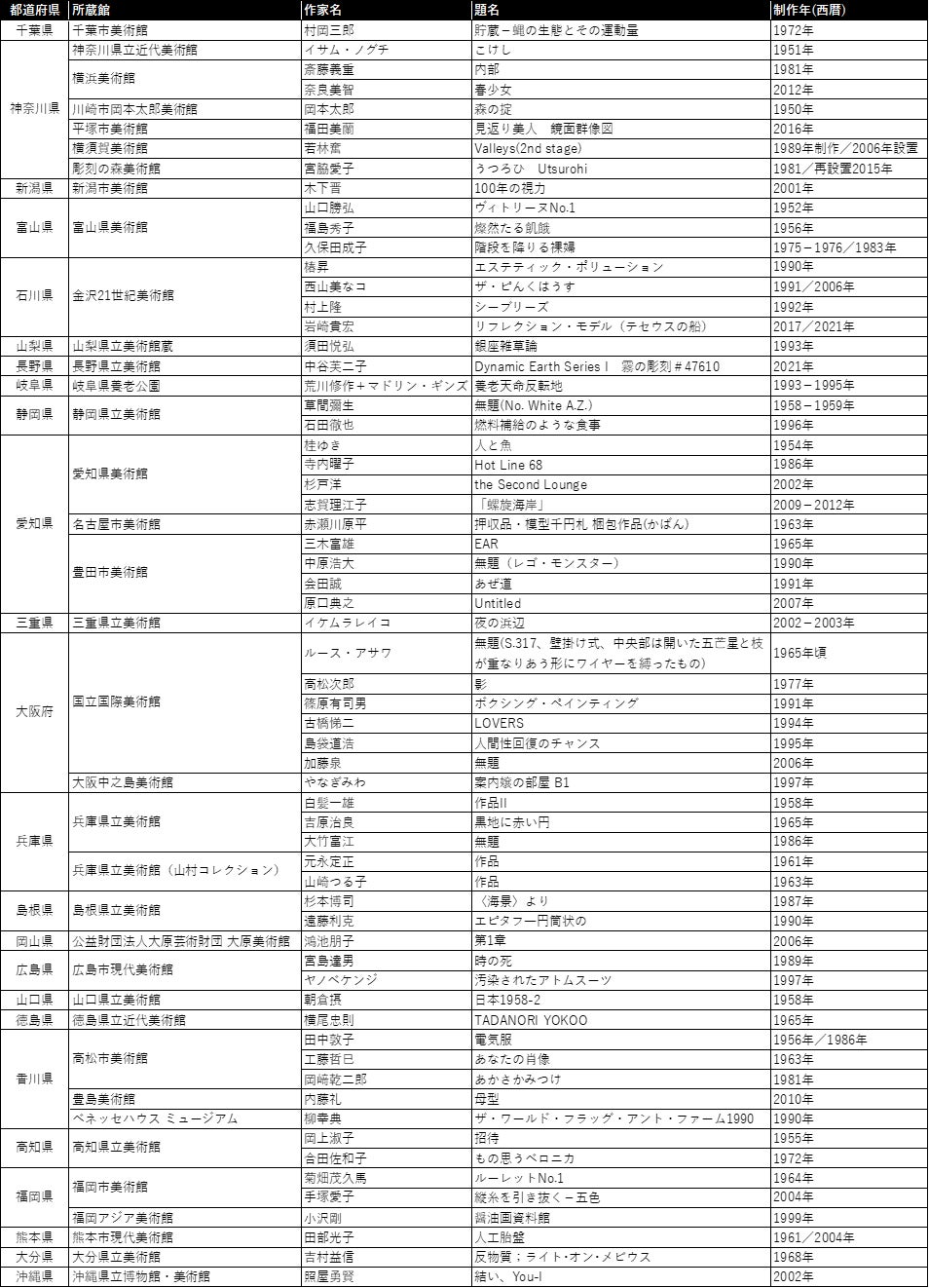 島敦彦(国立国際美術館長) 制作年代、男女比、地域のバランス、分野、国際性、今後の評価、話題性などさまざまな指標を考慮して、とにかく今あらためてご覧いただきたい作品群にまとめ上げることに努めました。選定作品は、各地の美術館でいつでもご覧いただけるものもあれば、いろんな事情で展示機会の少ないものも含まれます。しかし、何かの折に当該館あるいは貸出先の美術館で実見できる場合もありますので、多くの皆様に各地の美術館の魅力的なコレクションに注目していただきたいと切に願っています。 |