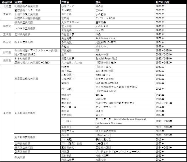 川浪千鶴(インディペンデント・キュレーター、元高知県立美術館企画監兼学芸課長) 今回の選定ではさまざまな観点が浮上しましたが、中でも地域と男女比のバランスを重視できたことはとても良かったと思っています。地方の美術館が編み上げた地域美術のコレクションには、近現代美術の歴史を問い直す重要な作品が数多くあります。女性作家たちの優れた作品群からは、男女が共につくってきた時代や社会のあり方についても学ぶことができます。 |