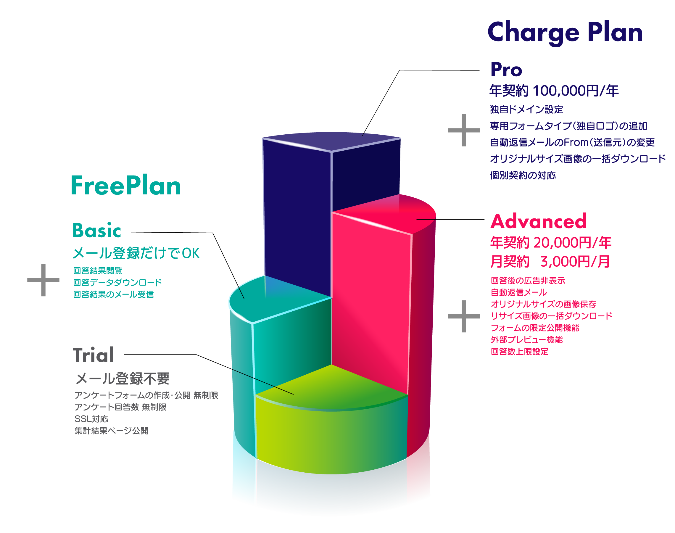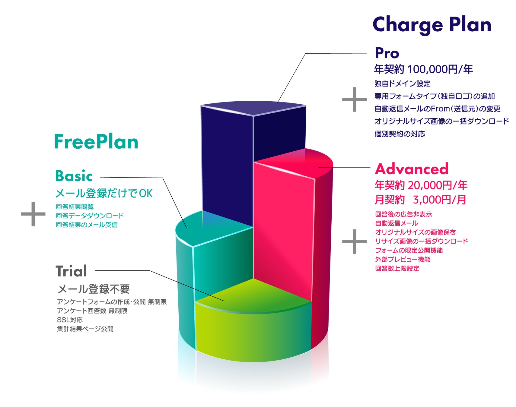 無料のTrialプラン、Basicプランの他に課金制のプランも2種用意しております。