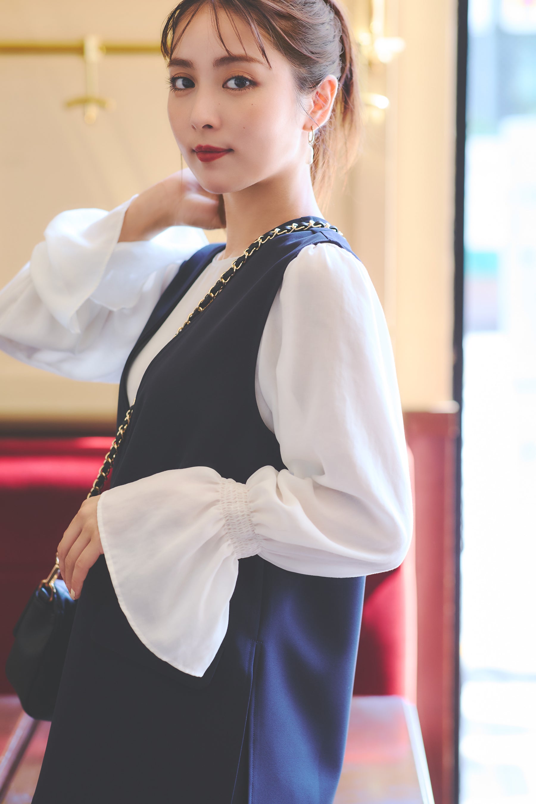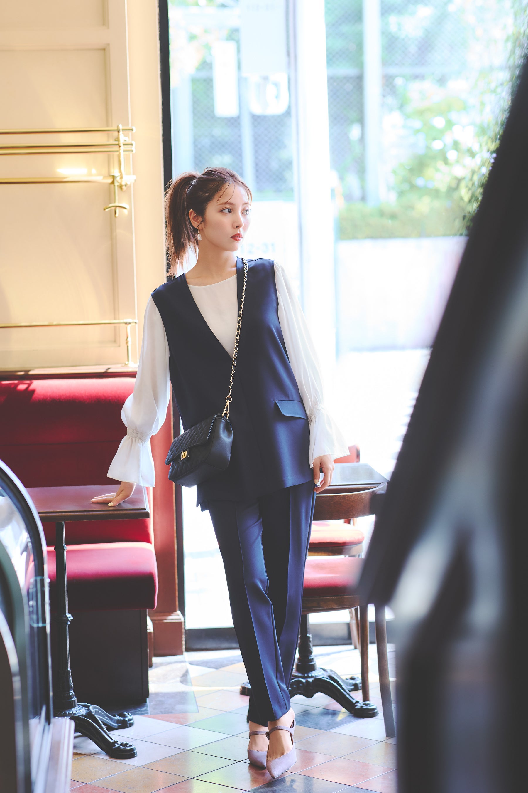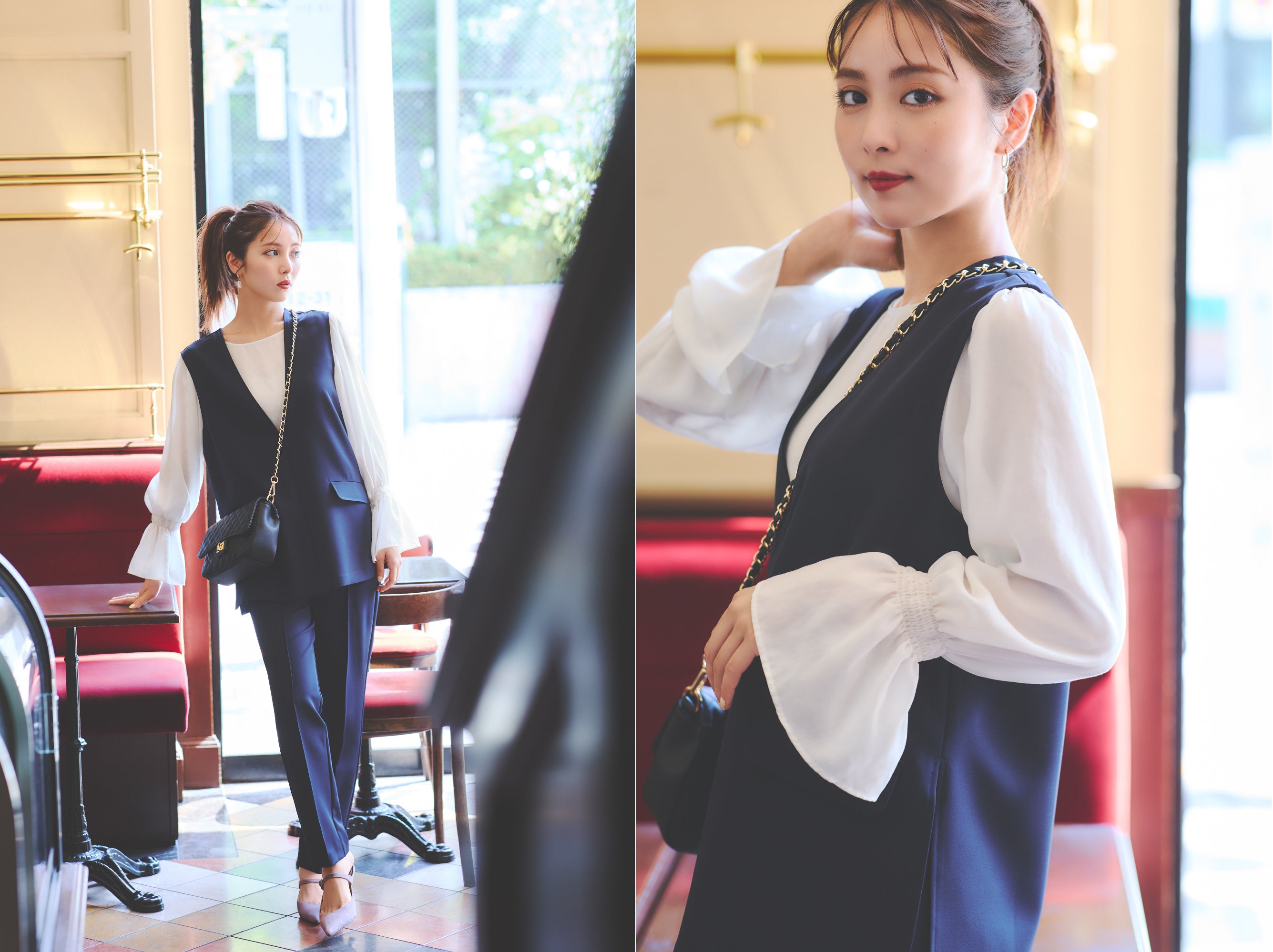 「セットアップにシャツ合わせもいいけれど、レディにしたい日は、あえて少し甘さのあるブラウスを重ねてみて。ベストタイプは袖コンシャスなトップスとの重ね着をアピールできるし、より今っぽい印象に仕上がります。」