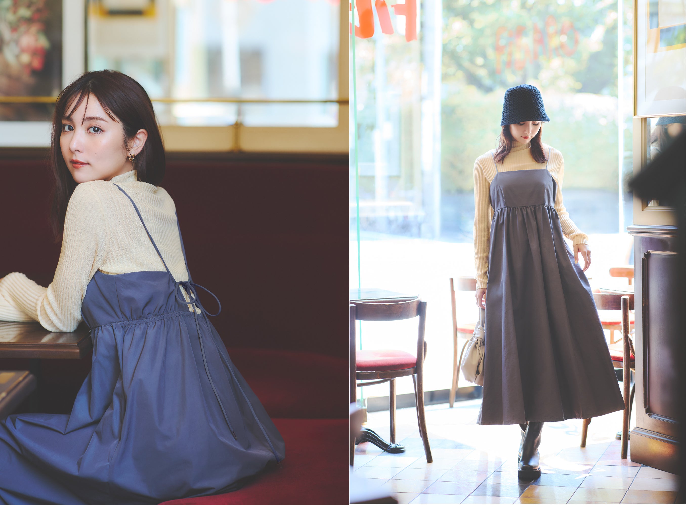 「ふんわりシルエットが可愛い安定のキャミワンピ。包容力があるトレンドのグレーをセレクトすることで、きれい色ともぐっとバランスが取りやすくなるので、レイヤードの幅が広がります。」