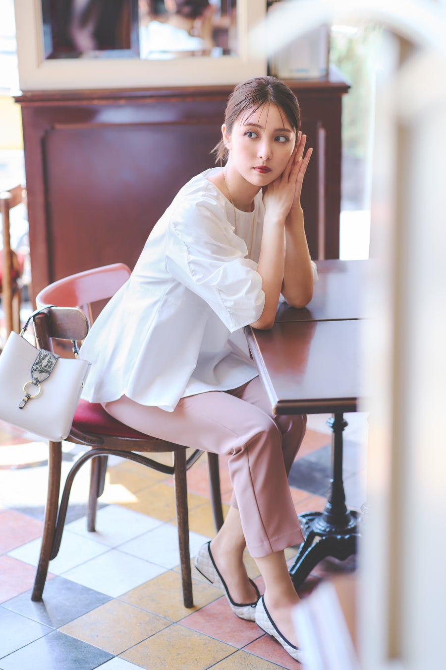 袖コンブラウスには“タイトヘア”と“赤リップ”。
