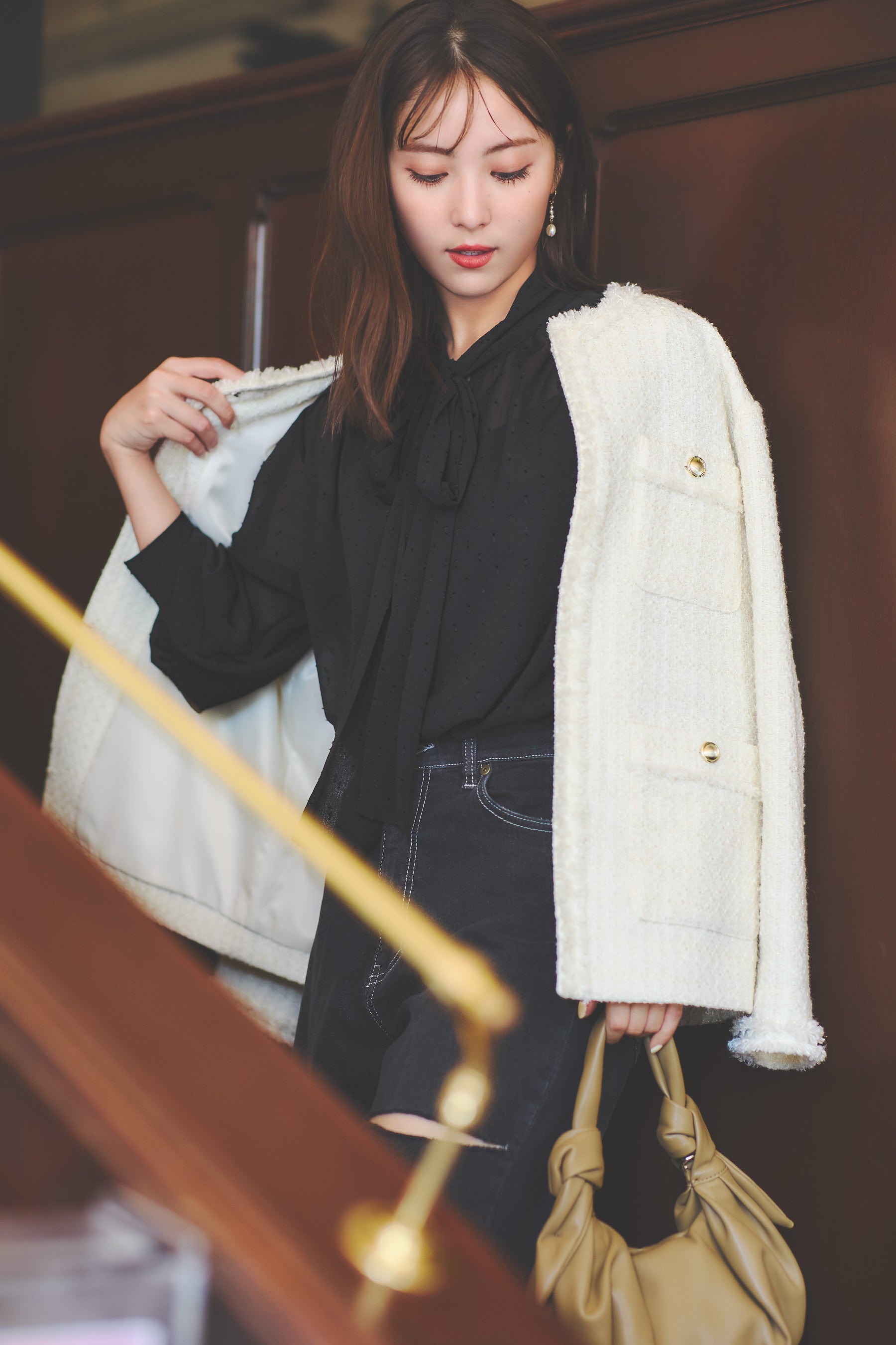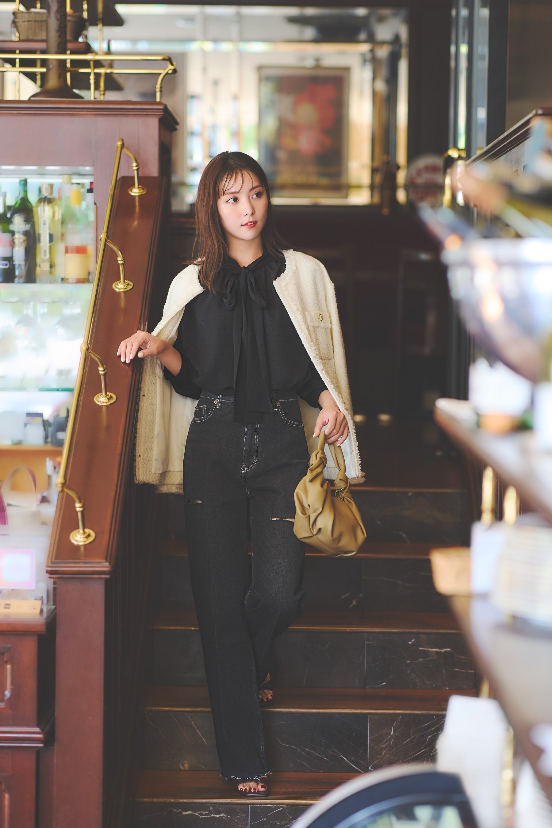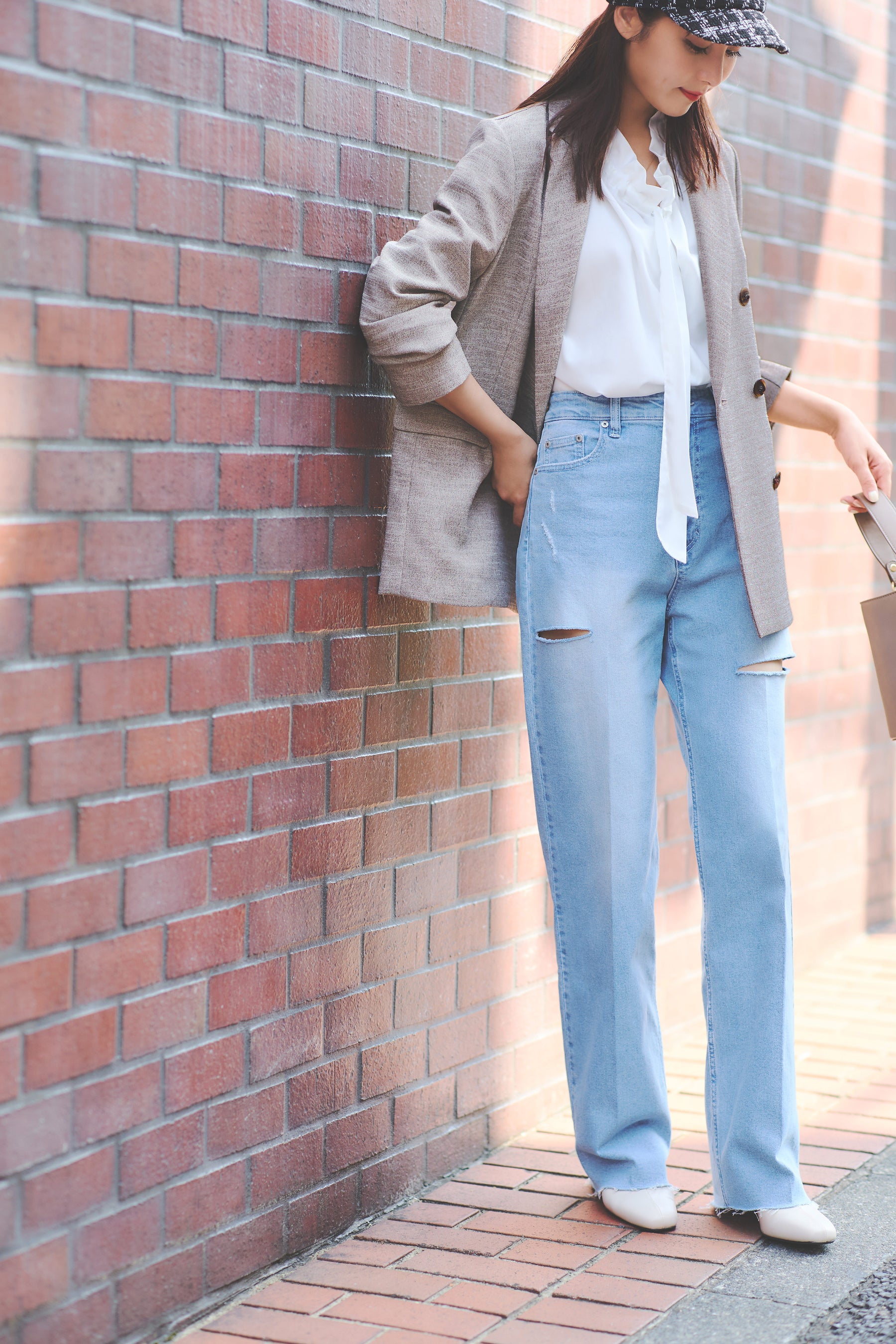 「ジャケット×ボウタイブラウスという、完成されたレディな組み合わせだからこそ、デニムはちょっぴり冒険してみるのもあり。やりすぎないカット具合と美シルエットの一本はフェミニン派も取り入れやすいはず。」