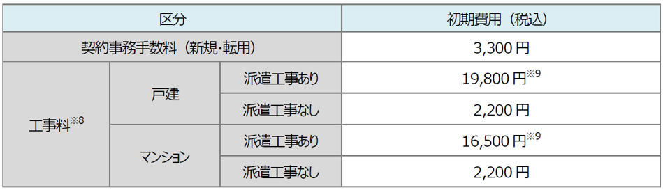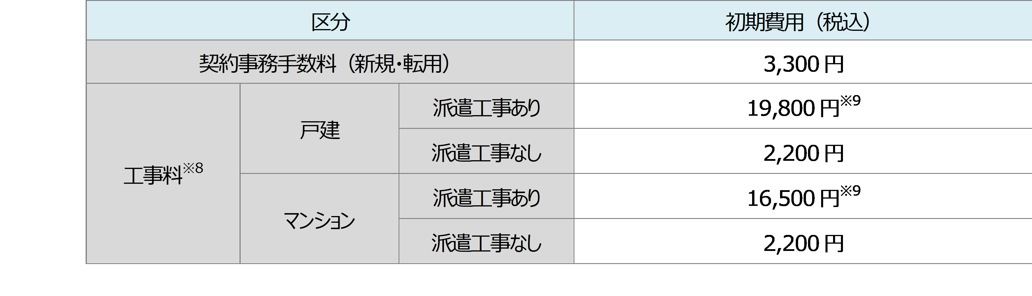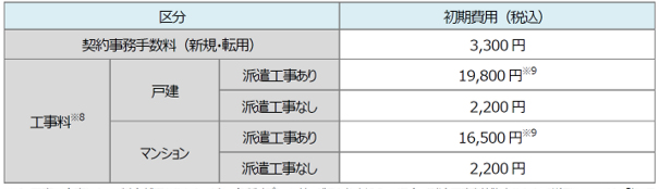 ※ 新規契約の契約事務手数料3,300円(税込)は別途必要です。土日祝日工事の追加工事料、オプション工事料、工事内容によって発生する追加料金は特典対象外です。