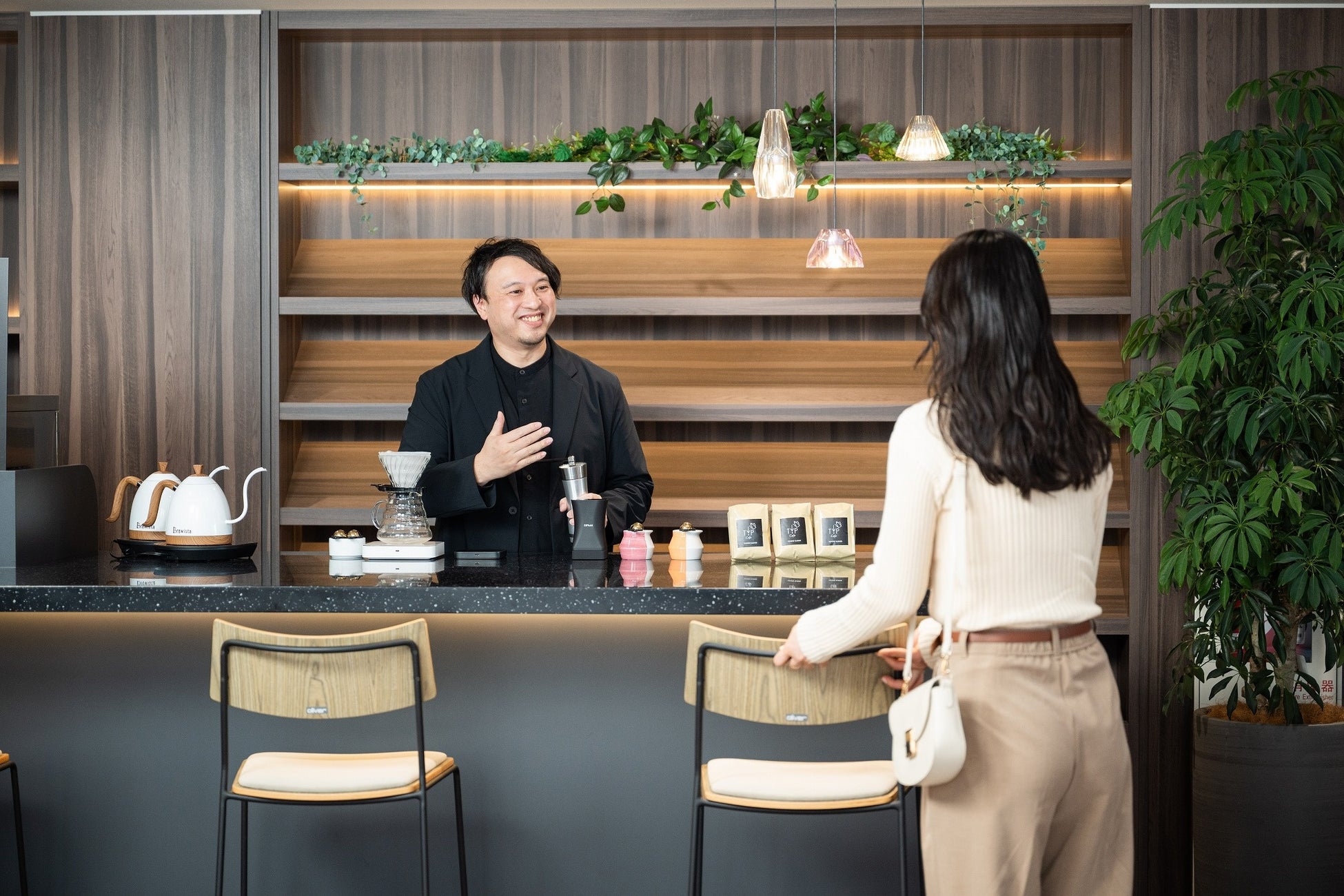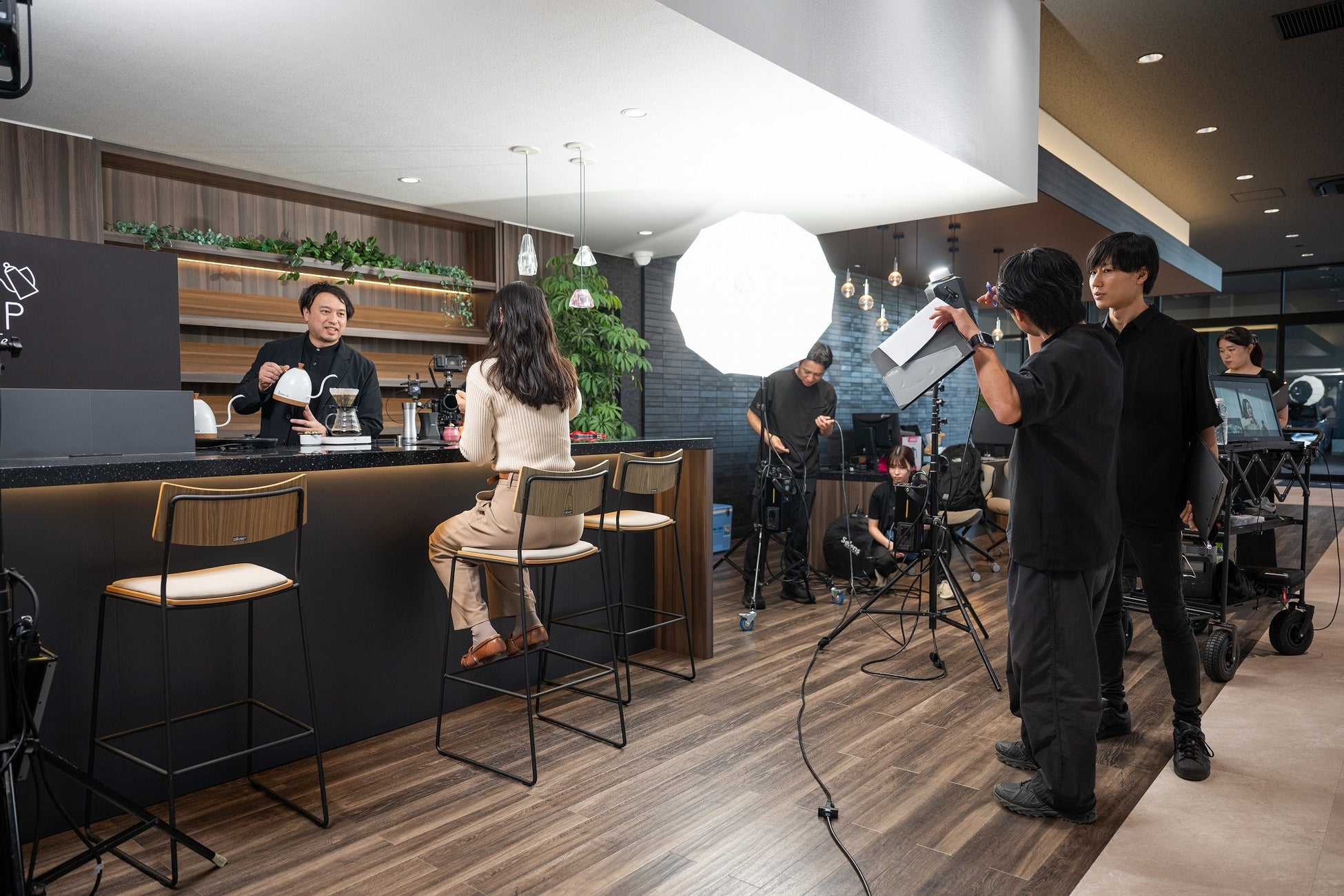 撮影は、実際の茨城トヨペットのショールームにて実施。定休日の落ち着いた店内で、本間バリスタが実際にカウンターに立ち、こだわりのコーヒーをお客様にご提供するシーンを撮影。