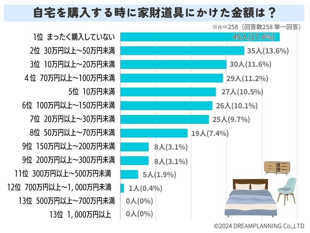 家財道具を購入した方で最も多かった価格帯は30万円以上~50万円未満。平常ならばかなり大きな出費ですが、自宅購入という人生の大イベントに臨んで気が大きくなる方は少なくありません。