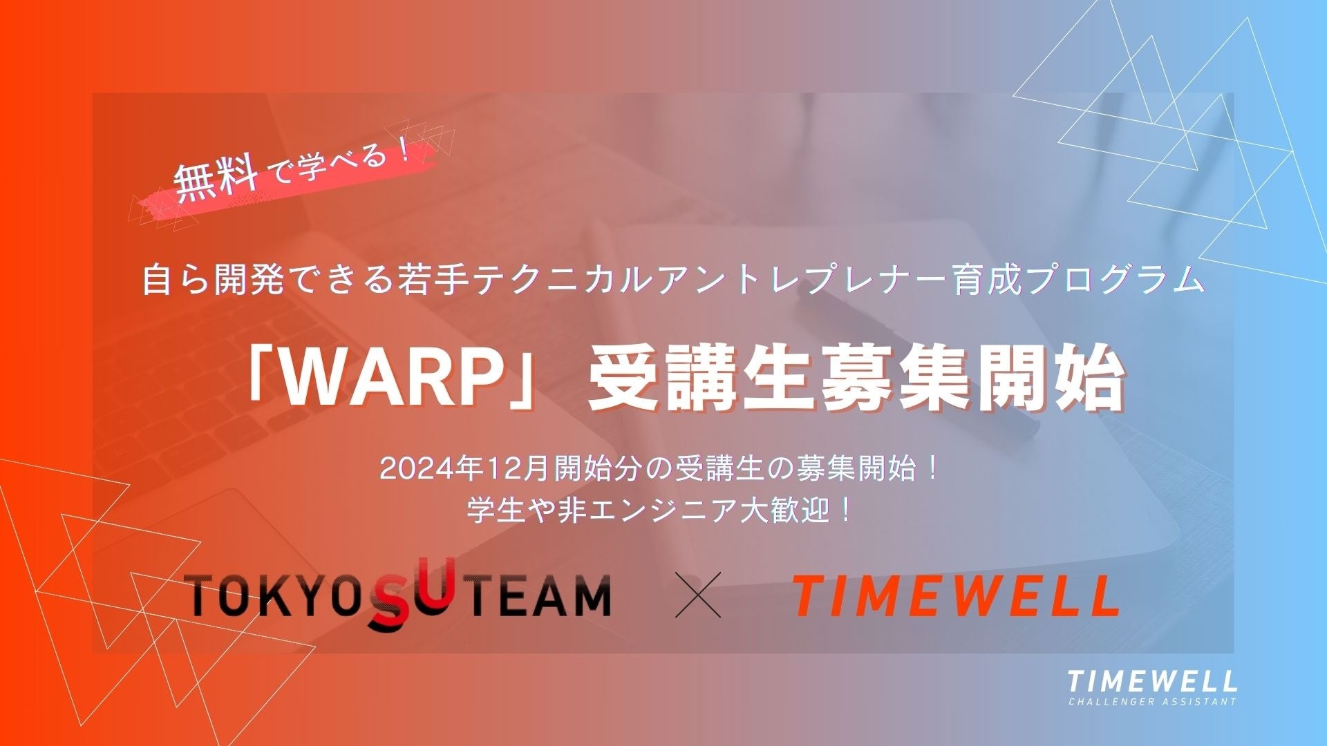 株式会社TIMEWELL(本社:神奈川県横浜市、代表取締役:濱本隆太、以下TIMEWELL)は、東京都と多様な主体によるスタートアップ支援展開事業「TOKYO SUTEAM」の協定事業者として、事業支援やアプリ開発、登記や実証実験まで、一部費用も含めてサポートし自ら開発できる、若手テクニカルアントレプレナー育成プログラム「WARP」※(以下WARP)の受講生の募集を開始します。2024年12月〜2026年3月までの期間で約2ヶ月の講座を計5回開催します。2024年11月3日から12月開始分の受講生の募集を開始いたします。