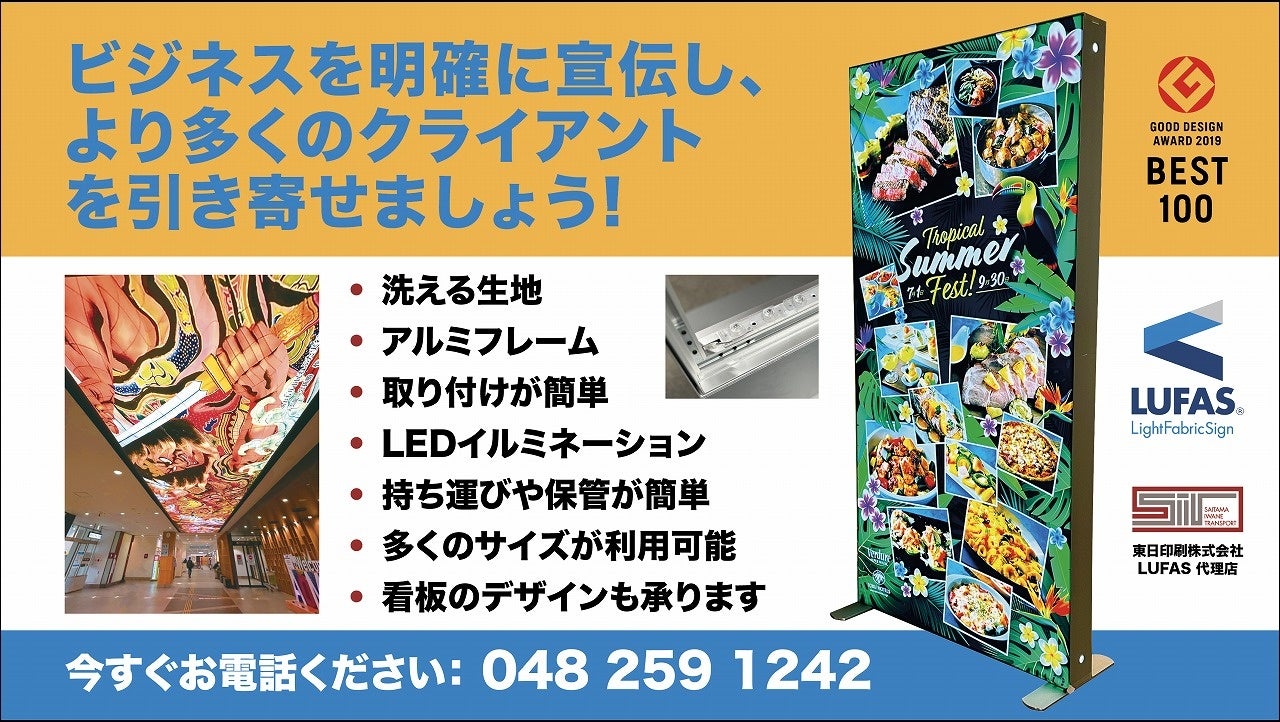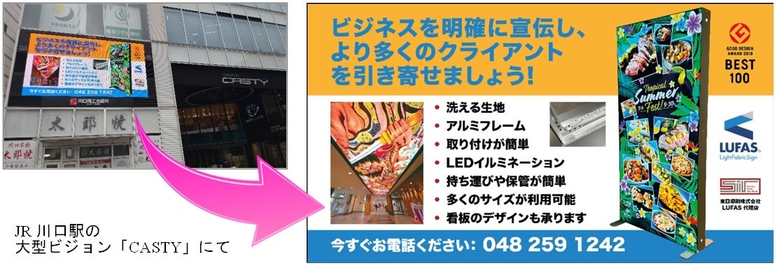 東日印刷・トライが製造・販売 電照布看板「LUFAS®」の広告をJR川口駅前で27日まで放映