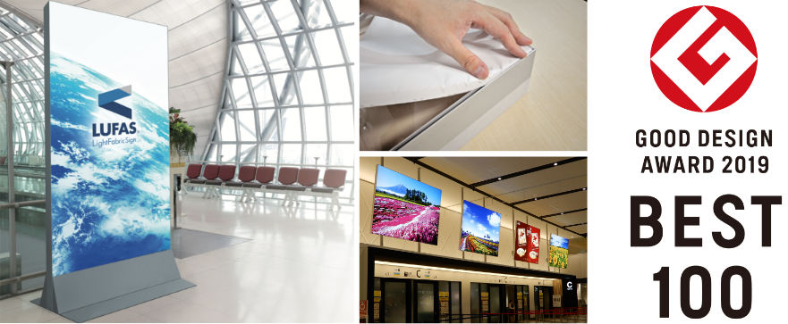 布製看板とは思えない美しい仕上がりで2019年度のグッド・デザインベスト100にも選出されました。環境にやさしいだけでなく、看板制作の初期費用、取り付け・取り替えなども大幅カットできます。
