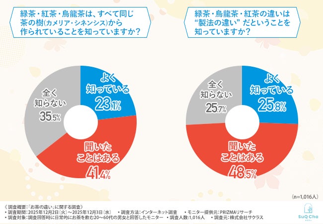そこで今回、日本全国の和紅茶を取り扱う『SuQ Cha(サクチャ)』(https://www.suqcha.com/)を運営している株式会社サクラスは、日常的にお茶を飲む20~60代の男女を対象に、「お茶の違い」に関する調査を行いました。