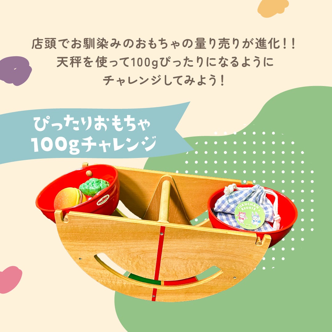 「ふくちゃんリユスタ」の店舗で実施する「おもちゃ量り売り」をモデルにした体験ブースです。片方に100gのおもりを乗せたてんびんのもう片方におもちゃを乗せ、およそ100gにできればおもちゃとりゆん&てすたのお面をプレゼント。失敗した場合も参加賞としてりゆん&てすたのステッカーをプレゼントします。