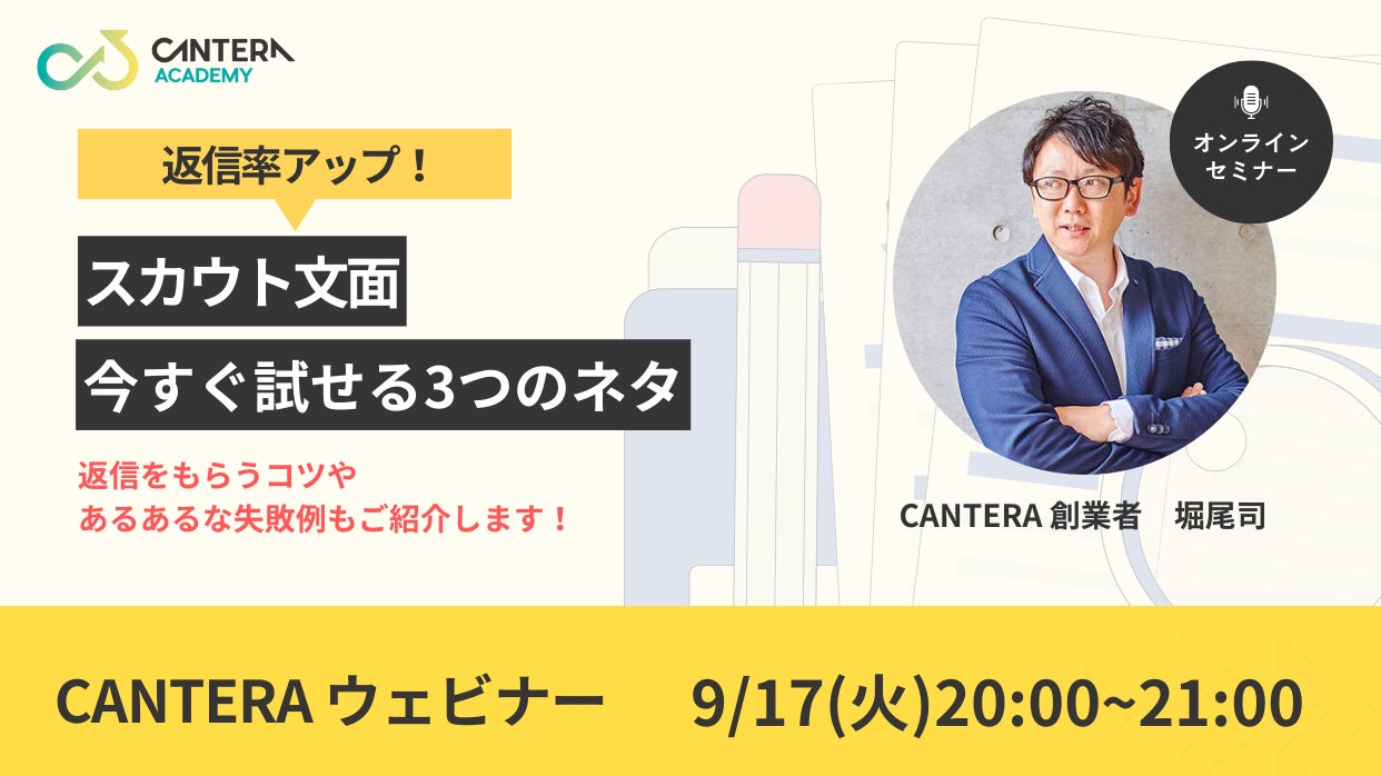 完全無料の人事向け学習ツール「CANTERA ACADEMY」にて採用に役立つウェビナーを開催!<9/17(火)20:00~21:00>|返信率アップ!スカウト文面の今すぐ試せる3つのネタ