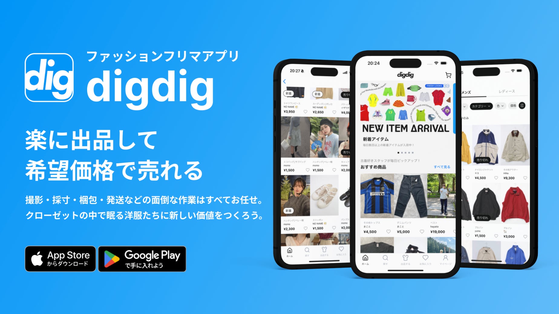 『digdig』は、服を売るときに感じる「面倒くさい」「安すぎる」といったユーザーの悩みを解決するために誕生した、ファッションフリマアプリです。ユーザーは、アプリから届く専用の出品キットに洋服を詰めて返送し、希望販売価格を入力するだけ。撮影・採寸・梱包・発送といった手間のかかる作業は、すべて『digdig』が代行します。