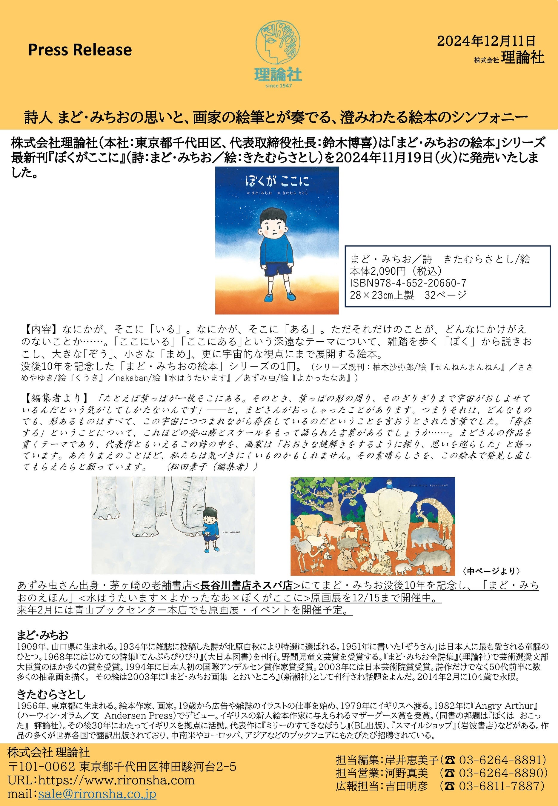 株式会社理論社(本社:東京都千代田区、代表取締役社長:鈴木博喜)は『ぼくがここに』(詩:まど・みちお 絵:きたむらさとし)を2024年11月19日(火)に発売、まど・みちお没後10年を記念し、原画展・イベント等を開催いたします。