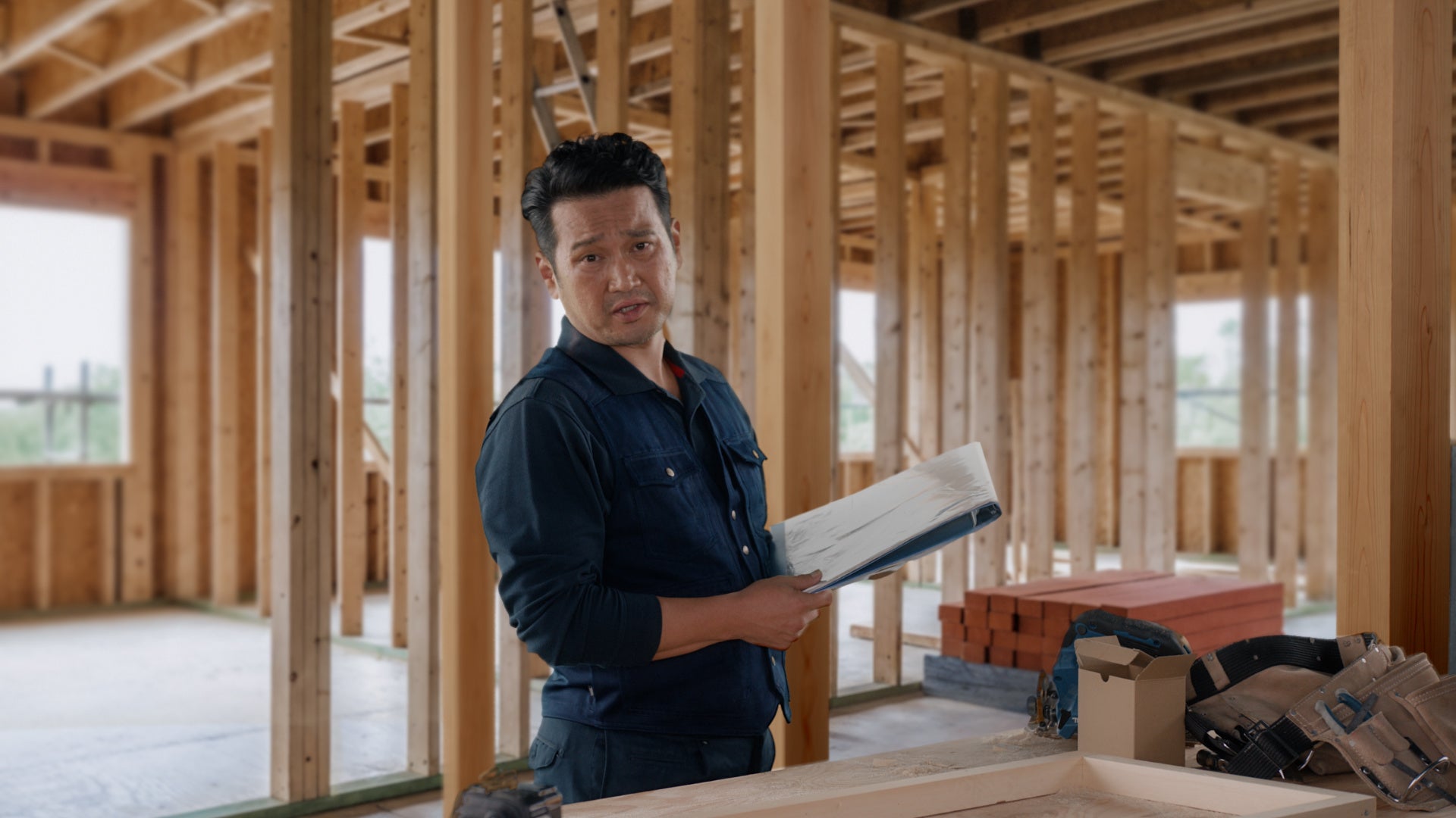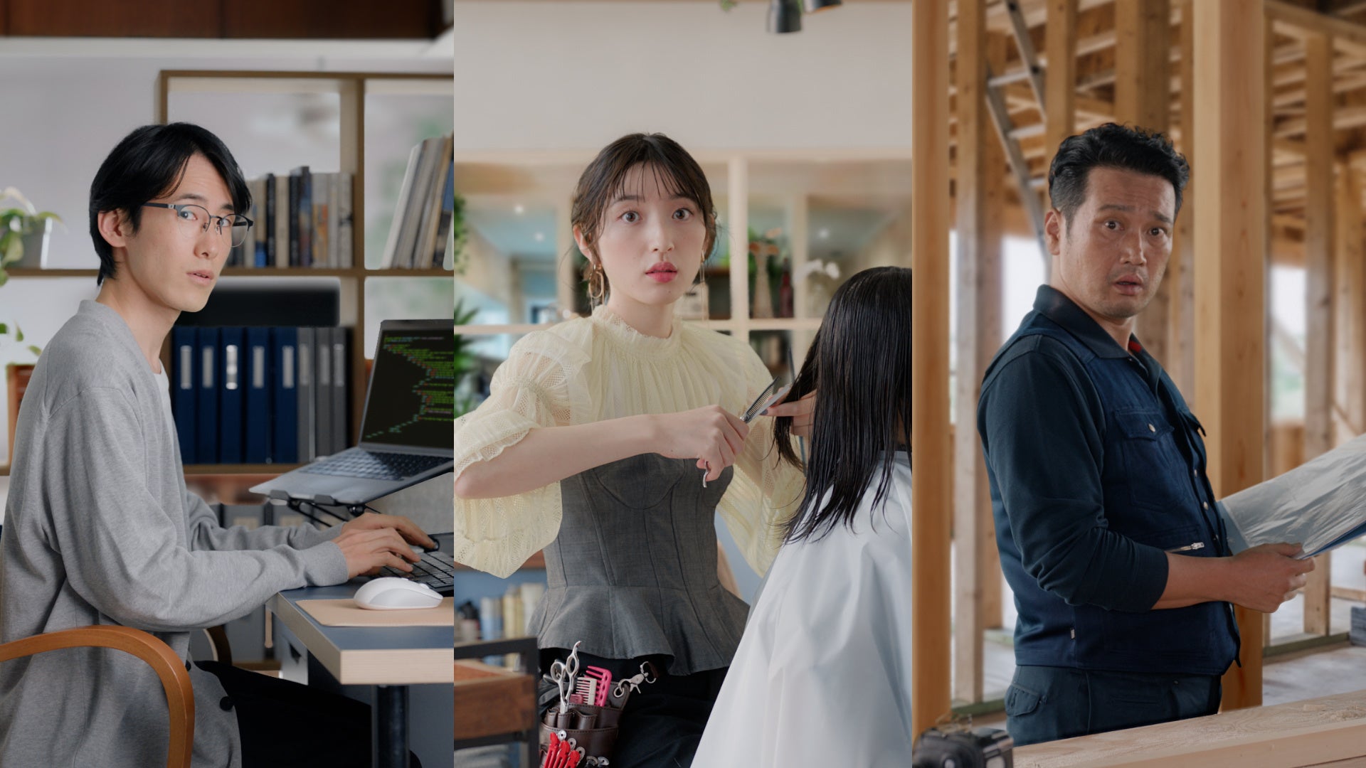 こたつに入り、リラックスした表情を浮かべる多部未華子さんが、まっすぐカメラを見つめながら「ねえ、確定申告、まだ自分で頑張ってるの?」と問いかけます。すると、ユーザーとして登場するエンジニア、美容師、親方の3名が驚いて振り返り、それぞれ「めんどくさい」「分からない」など、確定申告に対する悩みを口にします。