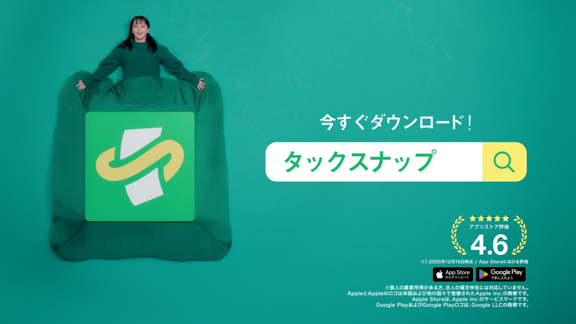 フリーランスなど個人利用に特化した「頑張らなくていい確定申告」をコンセプトとするスマホアプリ「タックスナップ」を運営する株式会社タックスナップ(本社:東京都杉並区、代表取締役:田中雄太)は、多部未華子さんを起用した新CMを、2026年1月15日(木)より放映開始します。
