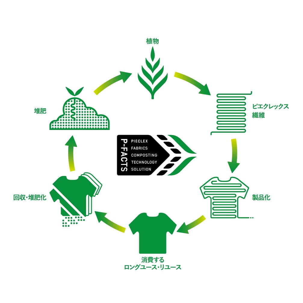 「P-FACTS」(ピーファクツ:PIECLEX FAbrics Composting Technology Solution)は、ピエクレックス社が植物由来のポリ乳酸素材「電気の繊維」ピエクレックスを使用したアパレル製品や繊維製品を回収し、堆肥化までを一貫して行う循環インフラです。多くのパートナー企業、自治体、福祉施設、学校法人などのステークホルダーと連携し、既に運用が始まっています。