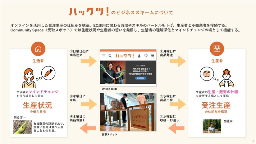 地元の農家やパン屋などの商品をインターネット上で注文し、市内の受取スポットで受け取ることのできるサービスを展開しています。単に商品を販売するだけでなく、体験企画として農家と直接触れ合える農業体験も提供しており、生産者と消費者を直接結び、コミュニティ形成につながる取り組みを展開しています。