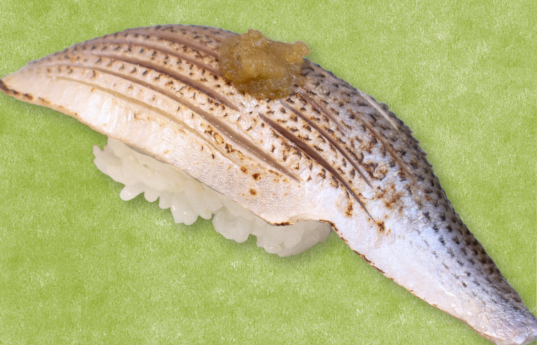 江戸前寿司の伝統的なネタ「このしろ」。肉厚で旨味のある味わいをお楽しみください。