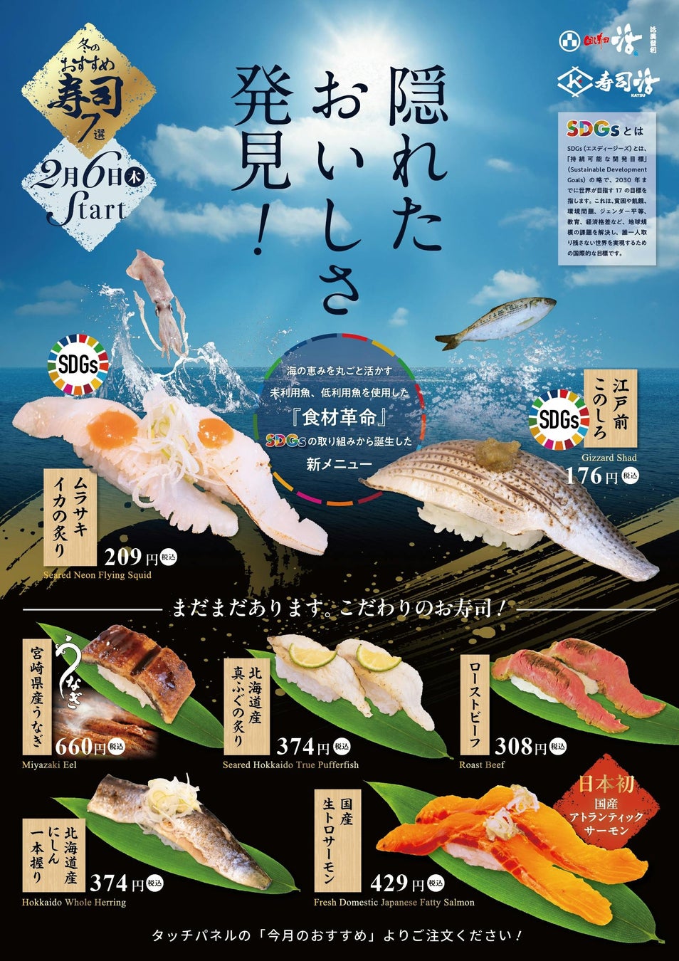 株式会社活美登利(本社:東京都品川区、代表取締役社長:土屋秀仁)が運営する「回し寿司活/寿司活」は、2月6日(木)より「未利用魚・低利用魚」を使用した新メニューを販売いたします。