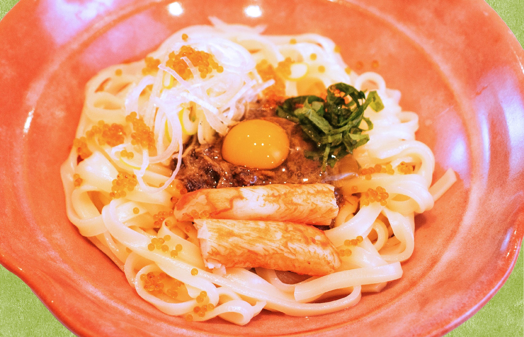 まぐろを使用した自家製辛味噌が相性抜群。寒い季節にぴったりの温かいまぜうどんです。