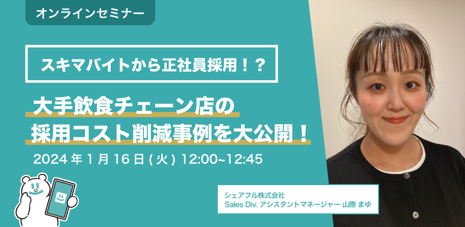 スキマバイトアプリ『シェアフル』、1月16日(火)にウェビナー「スキマバイトから正社員採用!? 大手飲食チェーン店の採用コスト削減事例を大公開!」を開催
