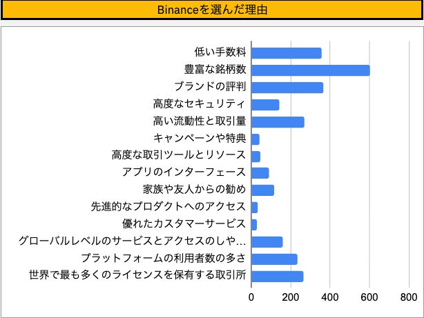 Binanceを選んだ理由として、日本ユーザーは「豊富な銘柄数」(603票)が最多で、次いで「ブランドの評判」(365票)、「低い手数料」(357票)を挙げました。