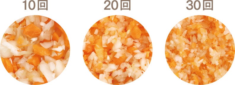 ハンドルを引く回数によって、みじん切りの粗さを簡単に調整できます。数回引くだけで粗めのみじん切り、さらに引き続けることでより細かいみじん切りに仕上げることが可能です。