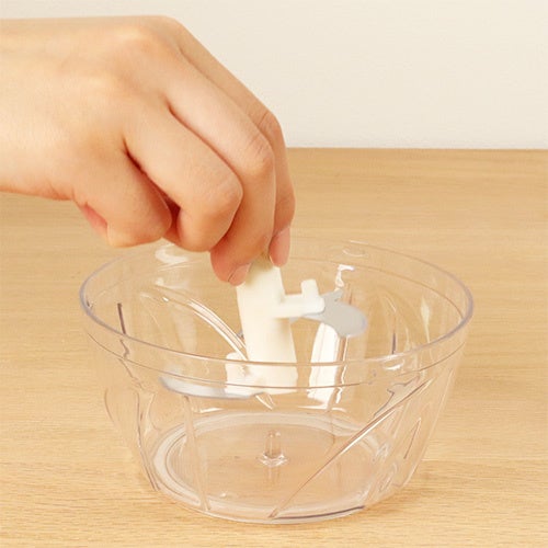 ⾷材を容器に⼊れ、ハンドルを引くだけで3 枚のステンレス製回転刃が動き、⼿早く均⼀なみじん切りができます。容器をしっかりと押さえ、ハンドルを⽔平に引くだけの簡単操作です。⾯倒な野菜のみじん切り作業が簡単に⾏えます。