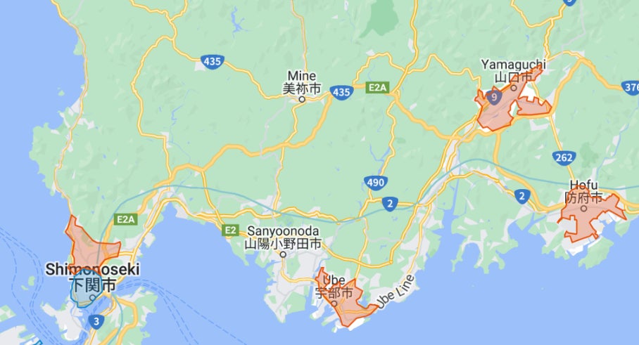 山口県山口市・宇部市・防府市の新規展開地域、下関市の新規拡大地域:マップの赤いエリア