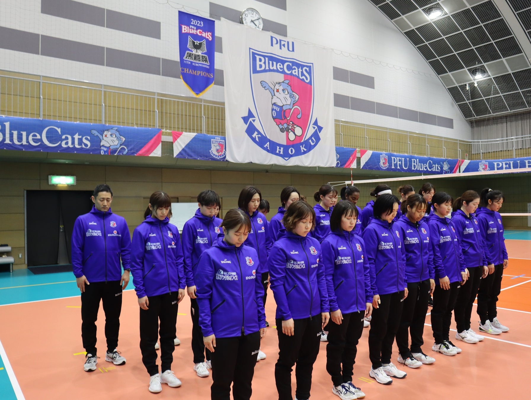「PFUブルーキャッツ石川かほく」は、2025年1月1日(水)、選手・スタッフが、「令和6年能登半島地震」で犠牲となられた方々に対しまして哀悼の意を表し、ご冥福と被災地の復興を祈念いたしまして、黙祷を行いました。改めまして、被害を受けられた方々とそのご家族のみなさまにお見舞い申し上げます。