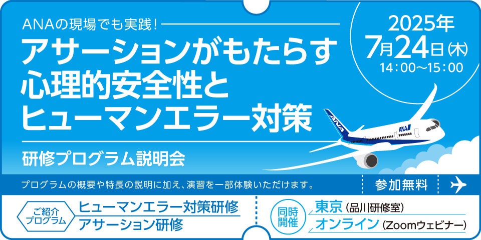 【7/24 東京・オンライン開催】ANAの現場でも実践!アサーションがもたらす心理的安全性とヒューマンエラー対策