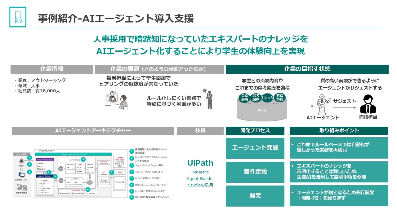 パーソルWSCは、これまでルールベースでは自動化が難しかった人事採用業務へのAIエージェント導入支援を実施しました。企業内に埋もれていたエキスパートのナレッジをAI エージェント化することで、学生の面談体験向上を実現しました。また、ヒトとAIエージェントが協働することで、従業員の“はたらくWell-being”の向上を目指しています。