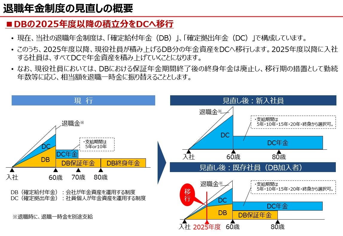 具体的には、2025年度以降、現役社員が積み上げる確定給付年金(DB)分の年金資産を確定拠出年金(DC)へ一本化し、各自が運用できる割合を高めることで、自身のライフプランに合致した資産形成を実現するとともに、現行以上の資産形成も可能な退職年金制度に見直します。