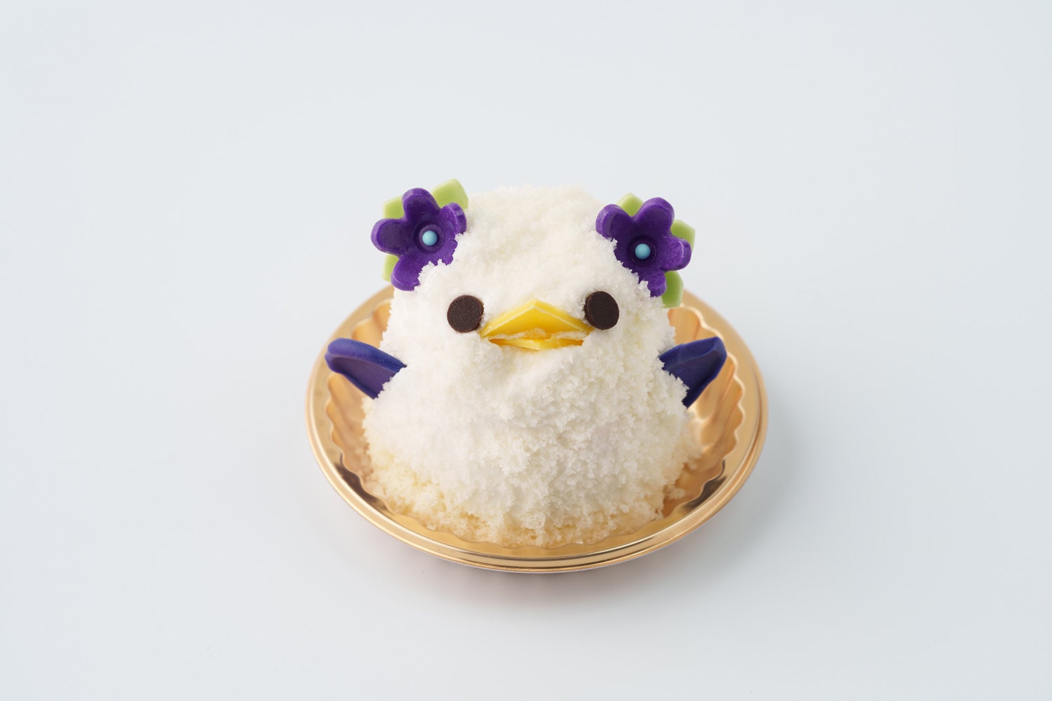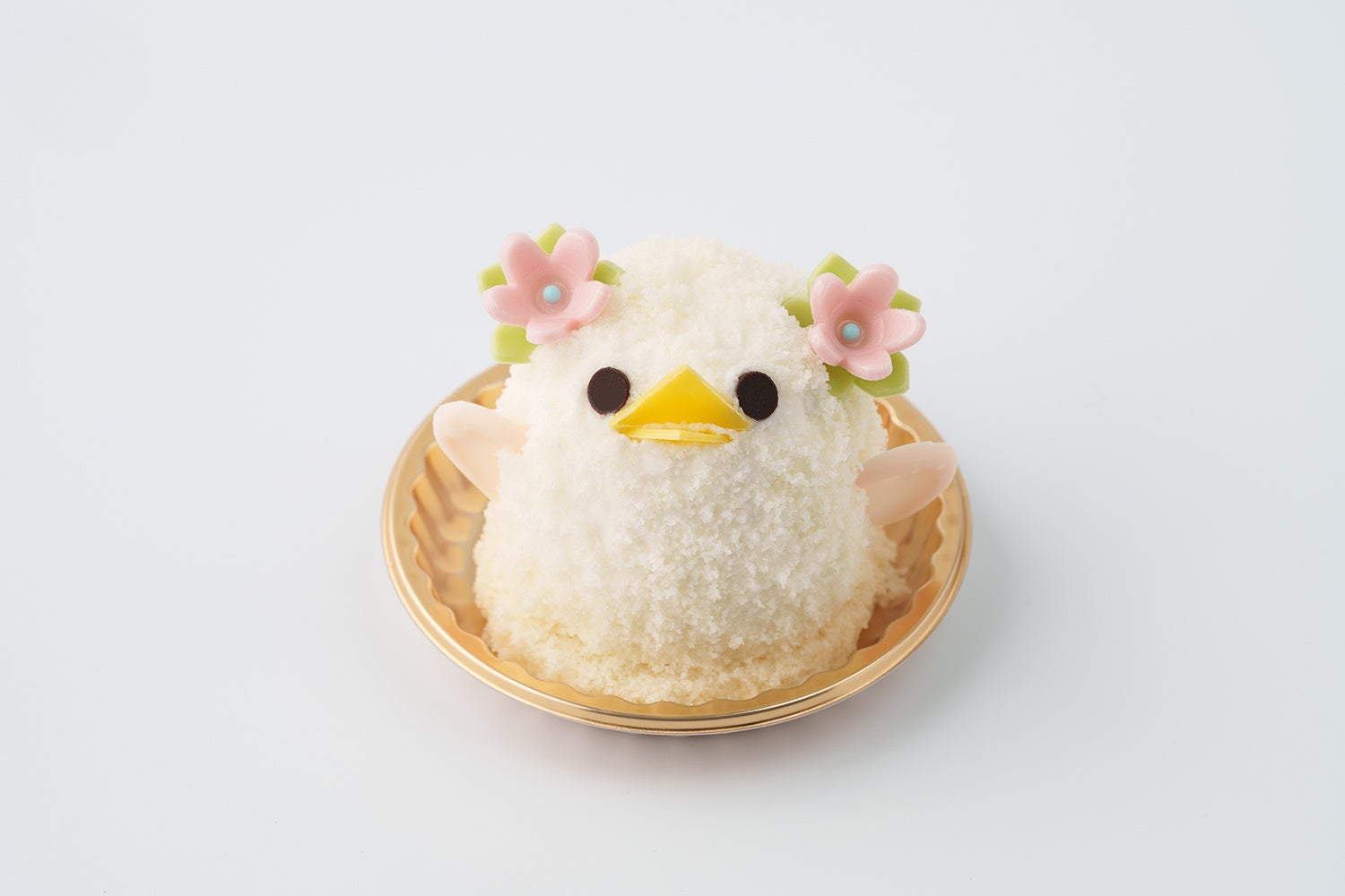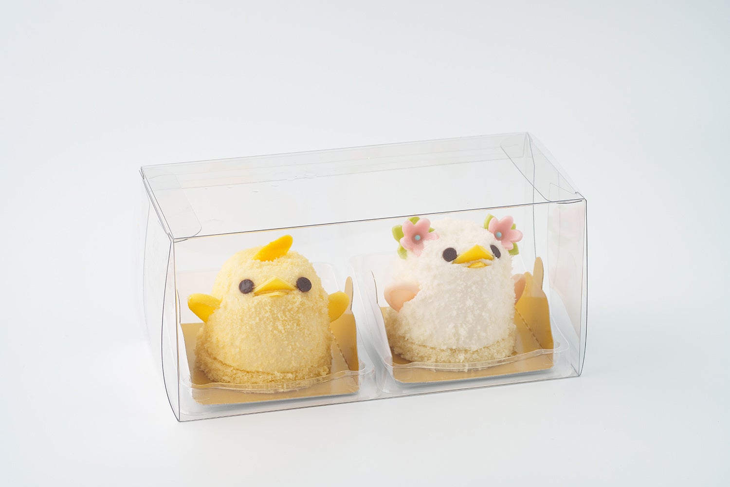 名古屋コーチンの卵を使った濃厚なプリンと桃のジュレを、杏仁風味のババロアで包み、白いスポンジのクラムをまとわせました。春節らしさを表現するため、中華風のお団子ヘアをイメージして、頭にチョコレートの花飾りをあしらっています。定番ぴよりんと横浜春節祭ぴよりんをセットで販売いたします。