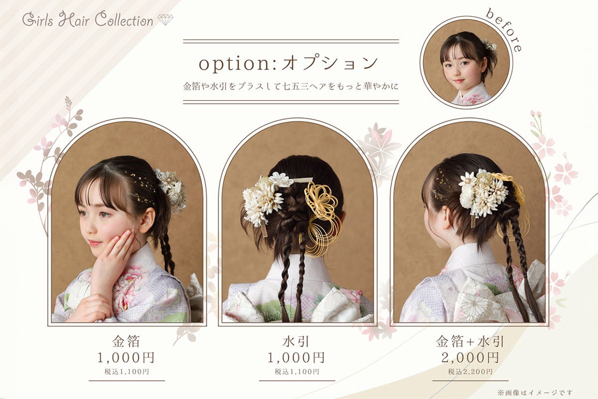 今シーズンより、七五三の写真撮影時のオプションとして「水引」と「金箔」のオプション(各1,000円)が追加されました。お子様の晴れの姿をより一層引き立てます。